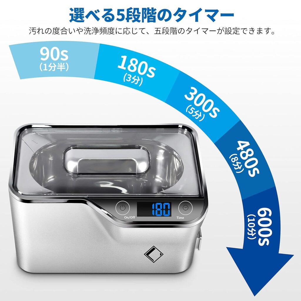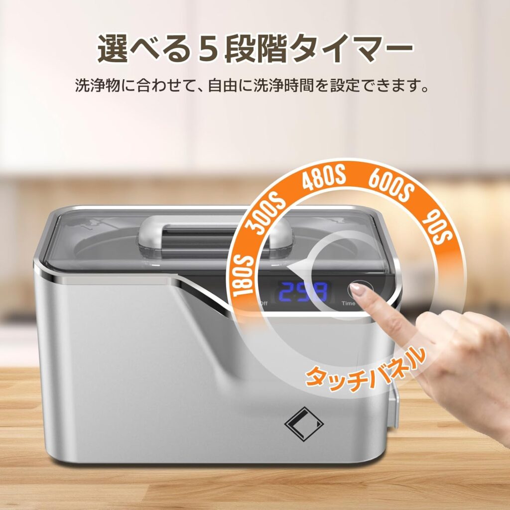 - タッチパネル操作+5段階タイマー: 90秒から480秒まで、汚れに応じて洗浄時間を設定可能。操作もタッチ式で簡単です。