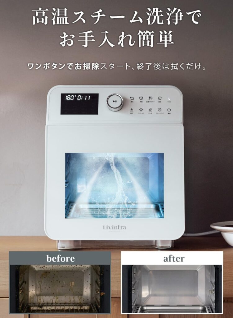 「スチーム洗浄機能が想像以上に便利です。調理後にボタンを押すだけで庫内がきれいになるので、面倒くさがりの自分でも毎日使い続けられています。」
