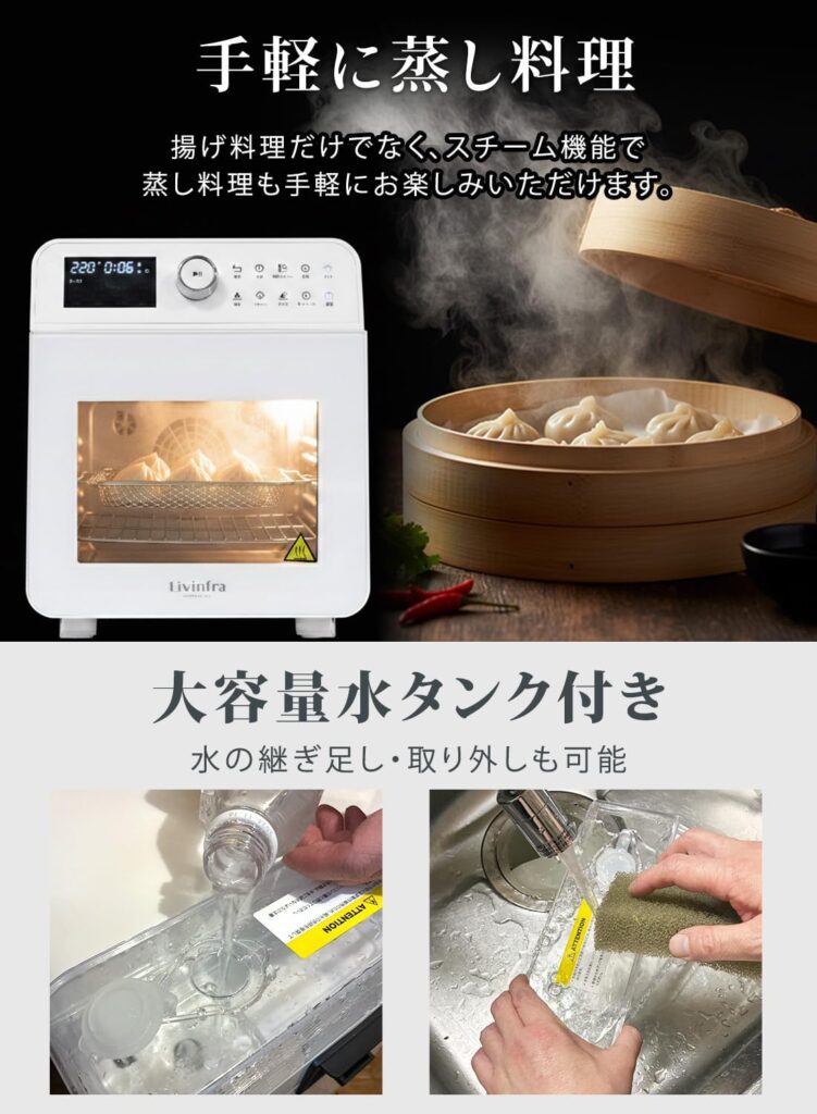 しかし、LVF-SNFFが他のノンフライヤーと一線を画すのは、「蒸す」機能を搭載している点です。