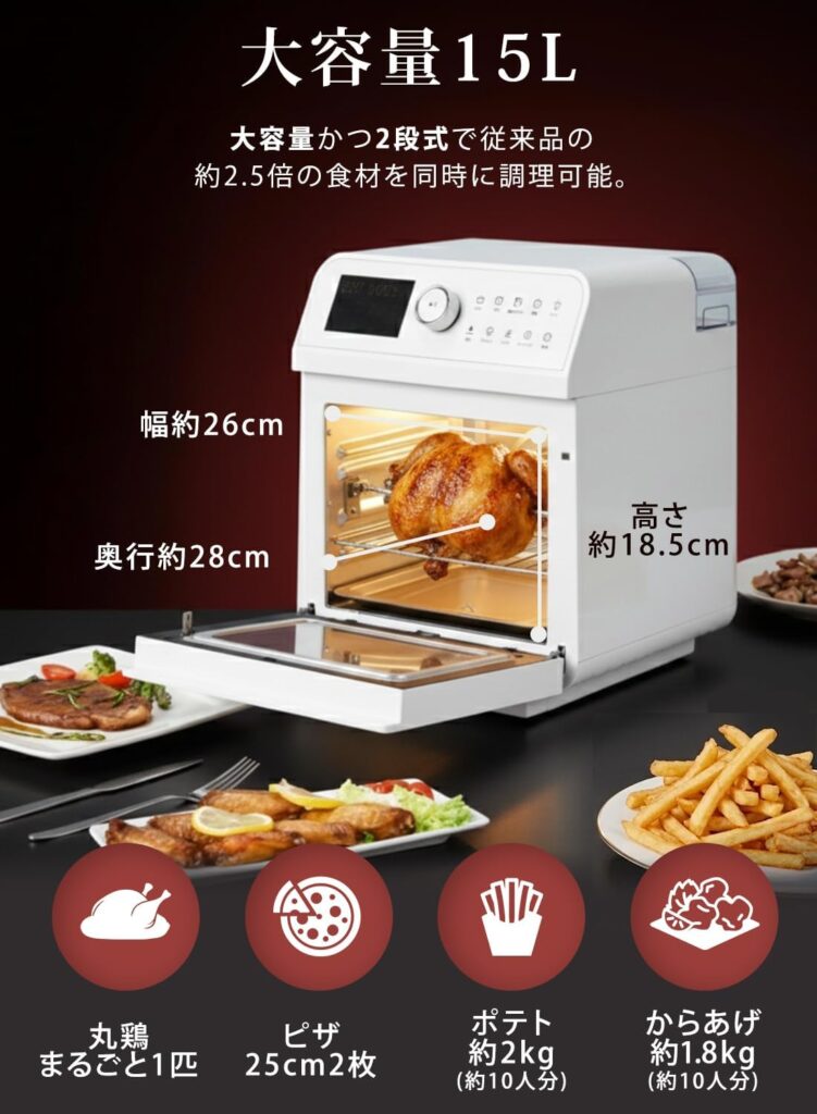 15Lという大容量も見逃せないポイントです。 3〜5人分の調理を一度にこなせるため、忙しい共働き家庭やファミリー層にとって、時短と満足感を両立できる頼もしいパートナーになります。 全16種のプリセットメニューにより、温度や時間の設定に悩む必要がなく、料理初心者でもボタンひとつで本格的な仕上がりが得られます。