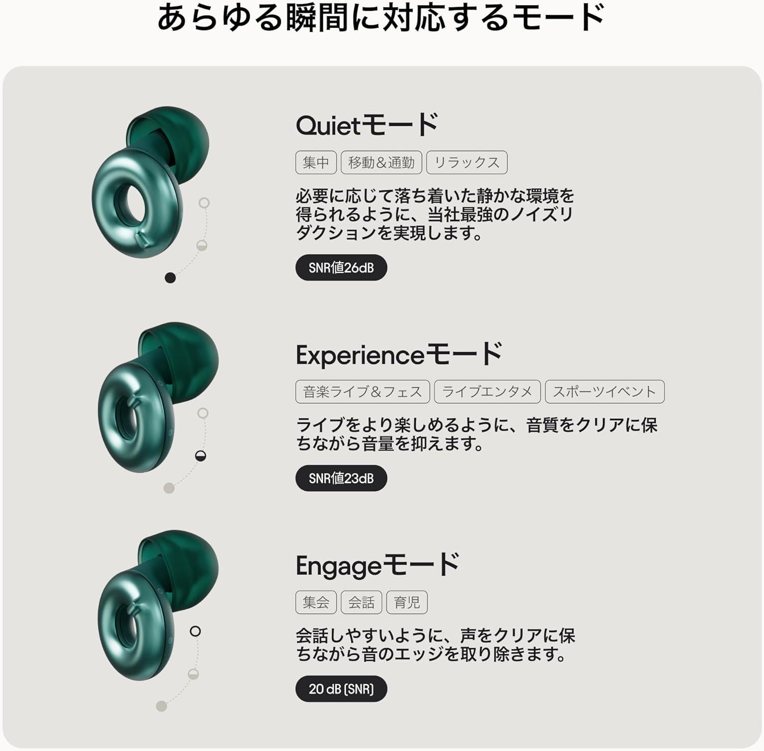 通常、耳栓は「遮音重視」「会話重視」など用途別に使い分ける必要がありますが、このモデルは本体についた機械式ダイヤルを回すだけで、以下の3つのモードを瞬時に切り替えられます。​