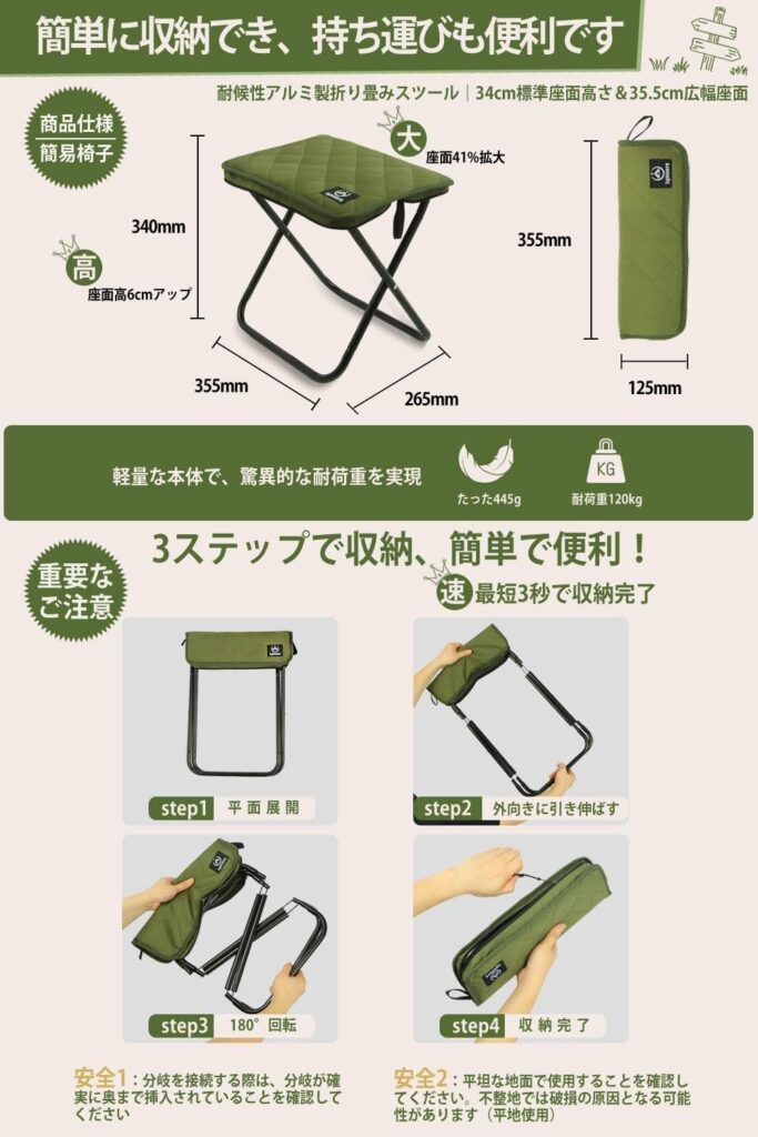 また、座面の高さが34cmと大人の膝よりもやや低めに設定されているため、足腰に不安がある方や、身長が高い方が頻繁に立ち座りを繰り返すような場面では、少し窮屈に感じたり膝に負担がかかったりする可能性があります 。さらに、本体重量が445グラムと非常に軽いため、自分が座っていない状態で強い風に煽られると、簡単に転倒したり遠くへ飛ばされたりするリスクがあります 。海辺や風の通り抜ける高台などで使用する際は、席を立つ時に重い荷物を座面の上に置いておくなど、環境に合わせたちょっとした工夫が求められます。