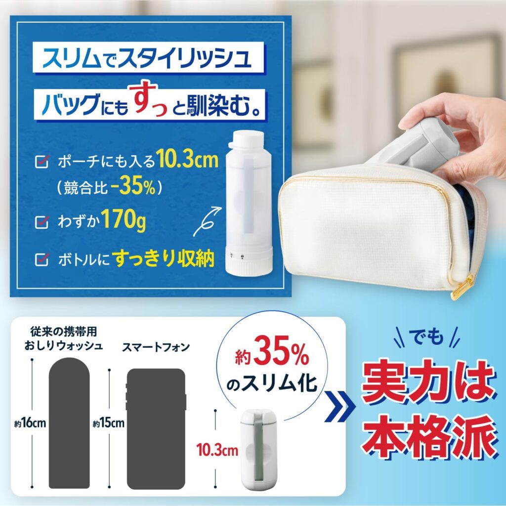 この商品の最大の魅力は、その圧倒的な携帯性にあります。重量わずか170グラム、長さ10.3cmというスマートフォンよりも小さなサイズ感は、まさに「持ち運ぶ」というコンセプトを完璧に体現しています。カバンやポーチの隅に忍ばせておけば、いつでもどこでも、自宅のトイレのような快適さを手に入れることができます。