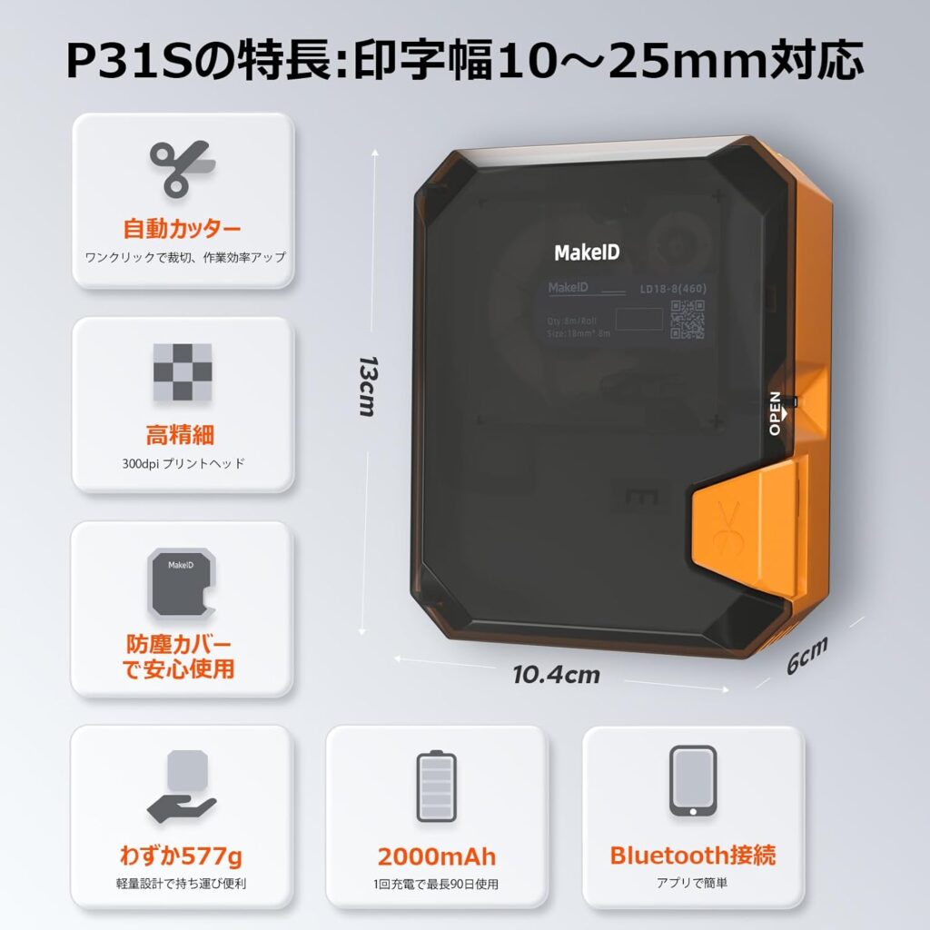 まず注目すべきは、印刷の「美しさ」と「持ち」です。国内メーカーの家庭用エントリーモデルの多くは、200dpi程度の解像度を採用していますが、Makeid P31Sは300dpiという上位機種クラスのスペックを標準装備しています。この数値の差は、特に漢字の「はね・はらい」や、繊細なアイコンを印刷した際に明確に現れます。