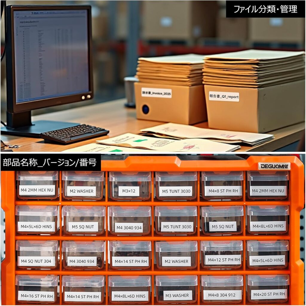 また、テプラの低価格モデルでは、熱を使わずに発色させる感熱方式が主流ですが、P31Sは一貫して熱転写方式にこだわっています。熱転写は、リボンのインクを熱で転写するため、油や薬品、強い日差しにさらされる環境でも文字が消えにくいという特徴があります。ガレージでの工具管理や、ベランダのプランター識別など、過酷な環境での使用を想定する場合、P31Sの耐久性は国内ブランドのスタンダードモデルを大きく凌駕します。