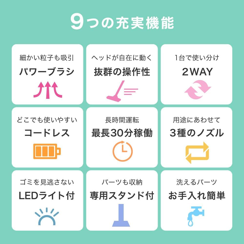 吸引力(Pa/Wの数値)・連続使用時間・充電時間・付属アタッチメントの種類・フィルターの種類・集塵方式(紙パック式か容器式か)といった、コードレス掃除機選びで多くのユーザーが確認したい情報が明示されていません。