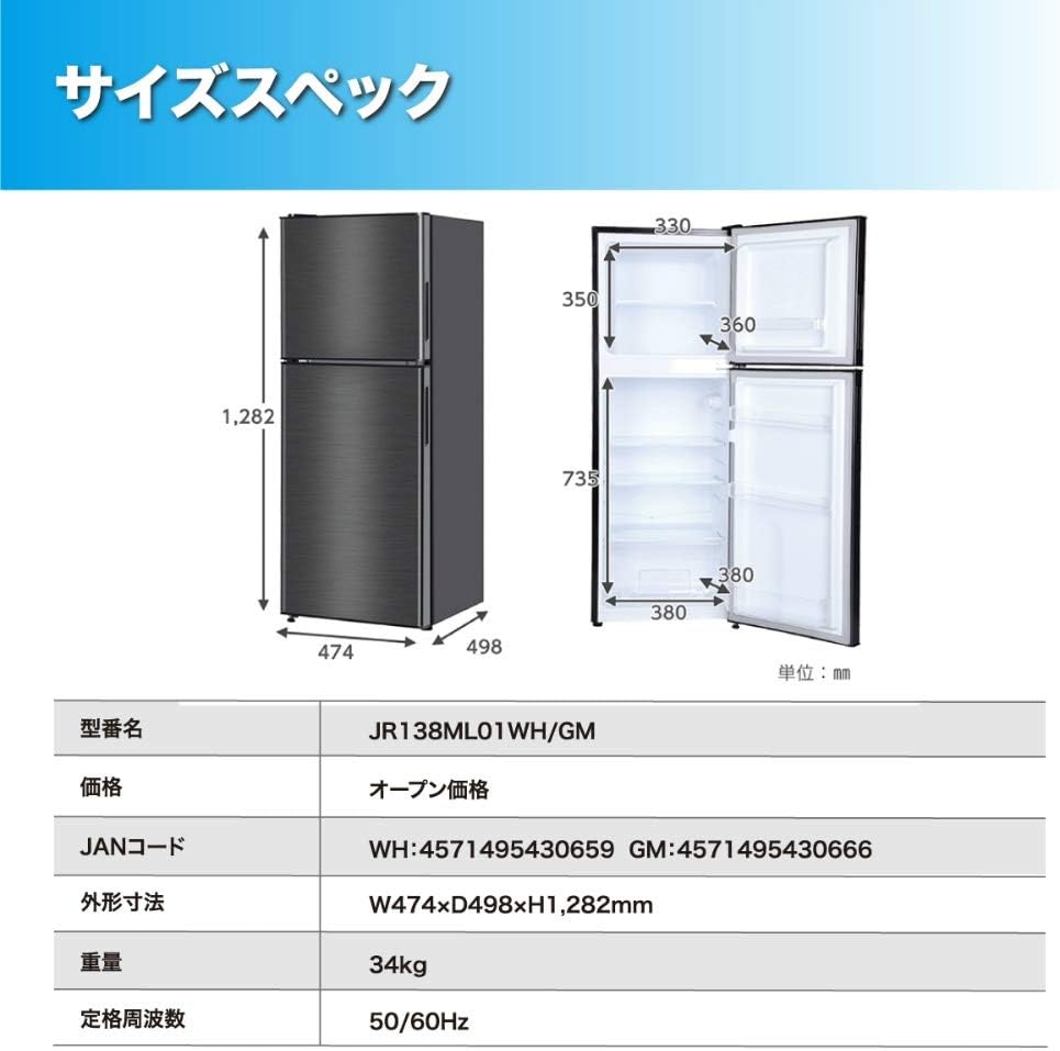 商品紹介:138L冷蔵庫「JR138ML01WH」