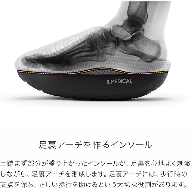 - インソール:土踏まず部分が盛り上がった形状で、足裏アーチを形成し正しい歩行をサポート。