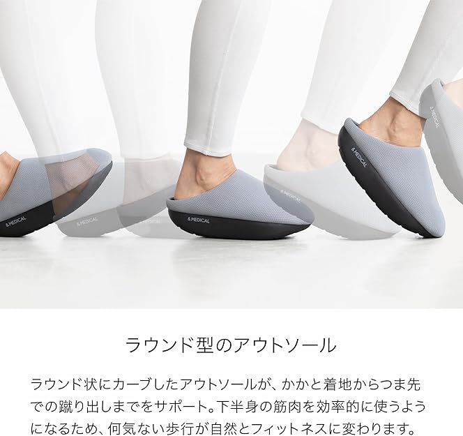 まず、安価なバラエティ雑貨店で販売されている一般的なダイエットスリッパとの比較です。多くの安価なモデルは、単に「かかとを無くす」ことで、ふくらはぎの筋肉を常に緊張させる仕組みを採用しています。これは短期的には負荷を感じやすいものの、長時間使用するとアキレス腱や腰への負担が大きく、姿勢を崩す要因にもなり得ます。対してKAMOLEG 2.0は、かかとが存在し、かつ「ラウンド状の底面」によって歩行の質そのものを改善します。筋肉を単に緊張させるのではなく、正しく「使う」ことを目的としている点が最大の差異です。