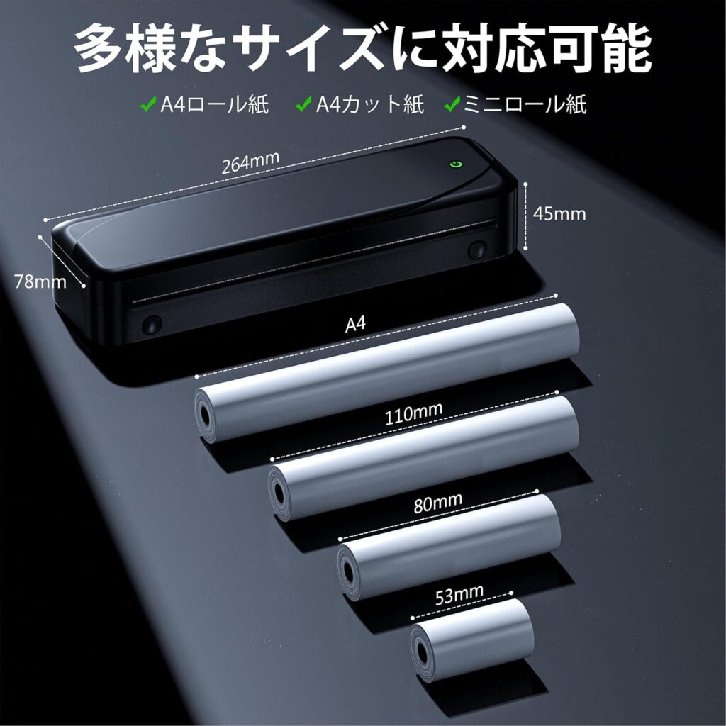 - 対応用紙サイズ:A4サイズを含め、53mm、80mm、110mmサイズにも対応可能