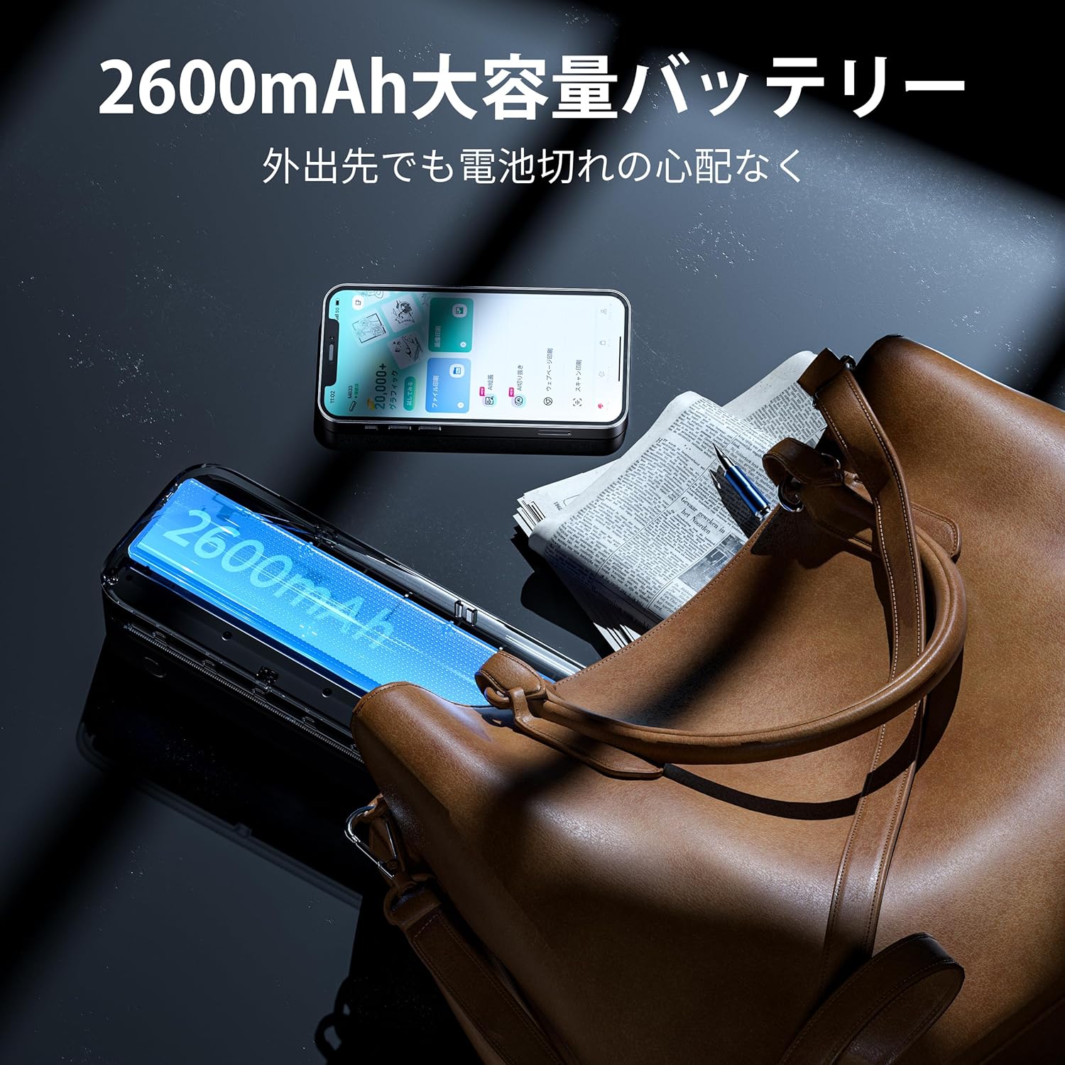 2600mAhの大容量バッテリーを搭載しているため、コンセントのない環境でも長時間の連続使用が可能で、屋外でのフィールドワークや車中での急な印刷にも対応できます。