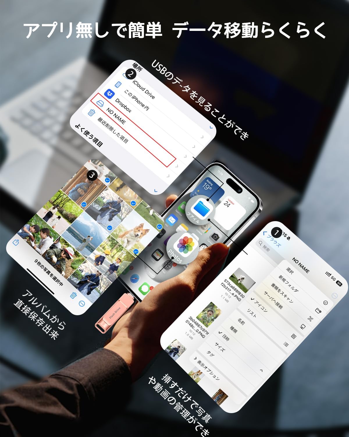 - 特徴:WiFi不要, アプリ不要, アルバム直接保存, 初心者に向けて, 容量不足解消