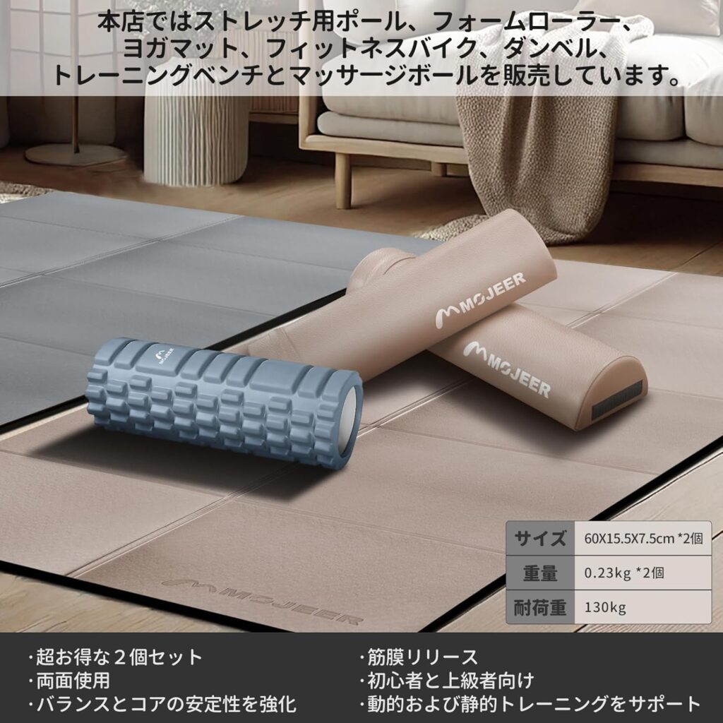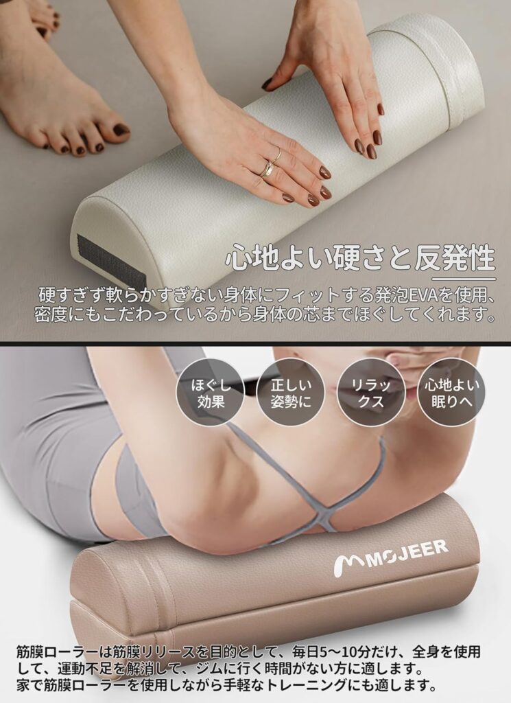 MOJEER YJZ60は、これに比べてより「ソフトで汎用的な使用感」を提供します。トリガーポイントは刺激が強いため、痛みに敏感な方やリラックス目的の方にはハードすぎる場合があります。一方、YJZ60のような中実タイプ(中が詰まっているタイプ)は、当たりが柔らかく、体重を預けた際に適度な沈み込みがあります。これにより、筋肉を強く「潰す」のではなく、優しく「伸ばす」感覚を得やすくなっています。「痛いのは苦手だが、しっかりほぐしたい」というニーズには、トリガーポイントよりもMOJEERのようなタイプが適しています。