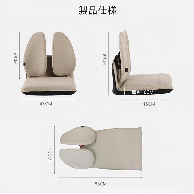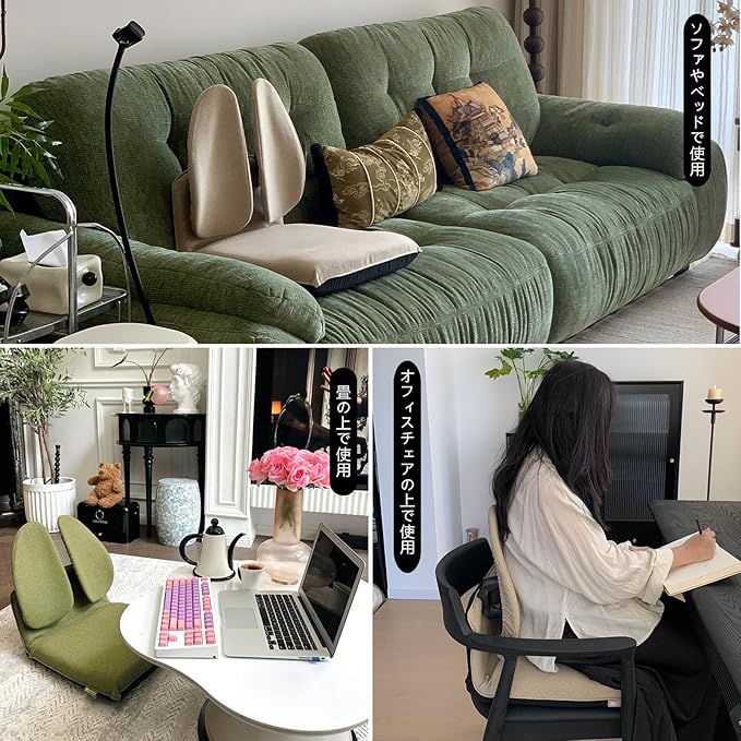 この座椅子「ZYZ」の最大の魅力は、人間工学に基づいた背もたれの設計にあります。 単に「背中を支える板」があるだけの座椅子とは根本的に異なり、背骨のS字カーブと骨盤の傾きに沿うようにデザインされているため、座った瞬間に「腰がすっと楽になる」感覚を得られます。 デスクワークやゲーム、読書など、つい前かがみになりがちな場面でも、自然と正しい姿勢へと導いてくれるのは大きなアドバンテージです。