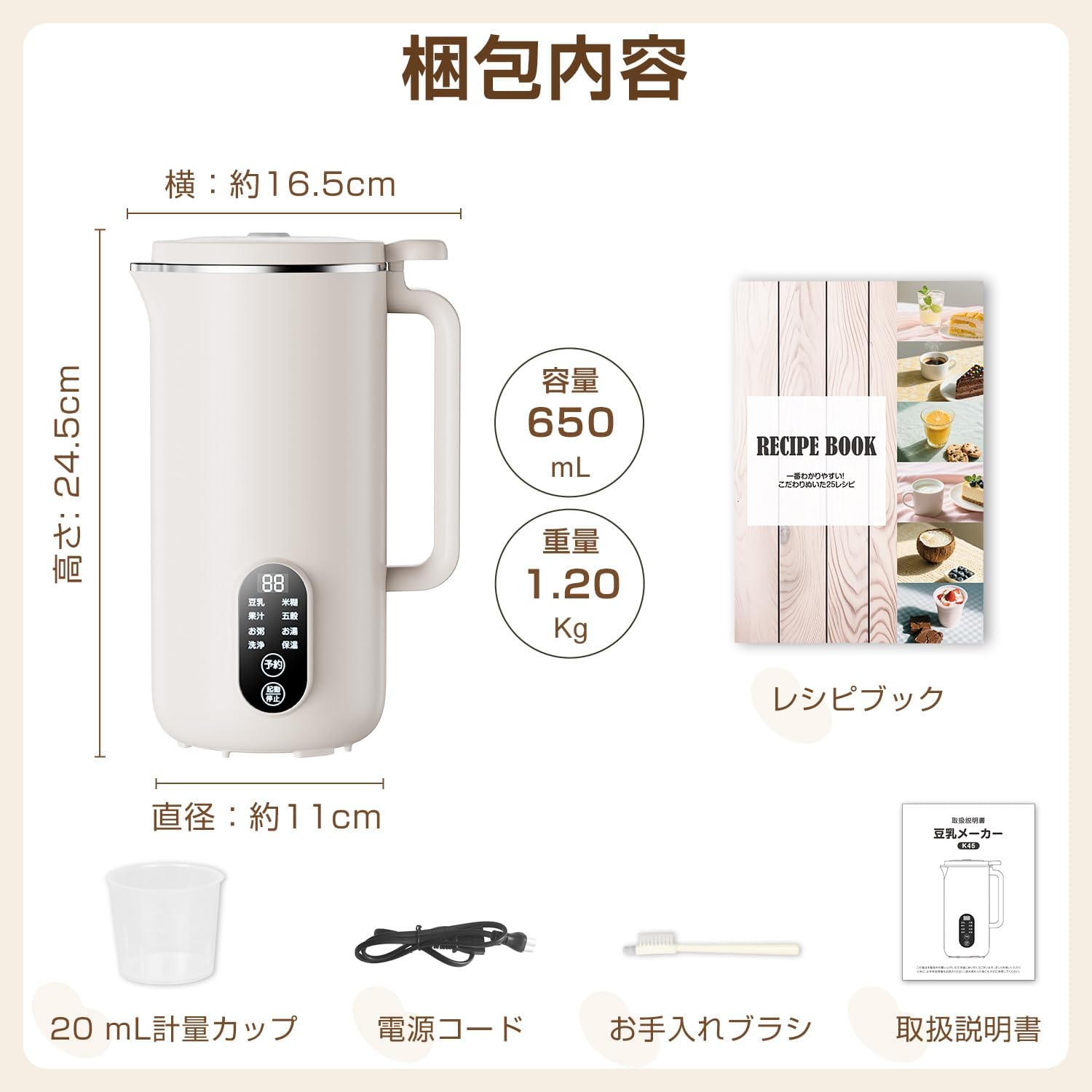 ベージュとホワイトを基調にした上品なフォルムで、豆乳・離乳食・おかゆ・ジュース・お湯沸かしまでこなす5役の多機能性と、浸水不要で約30分で豆乳が完成するという手軽さが特徴の製品です。