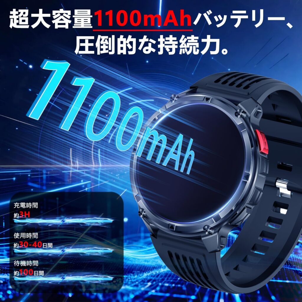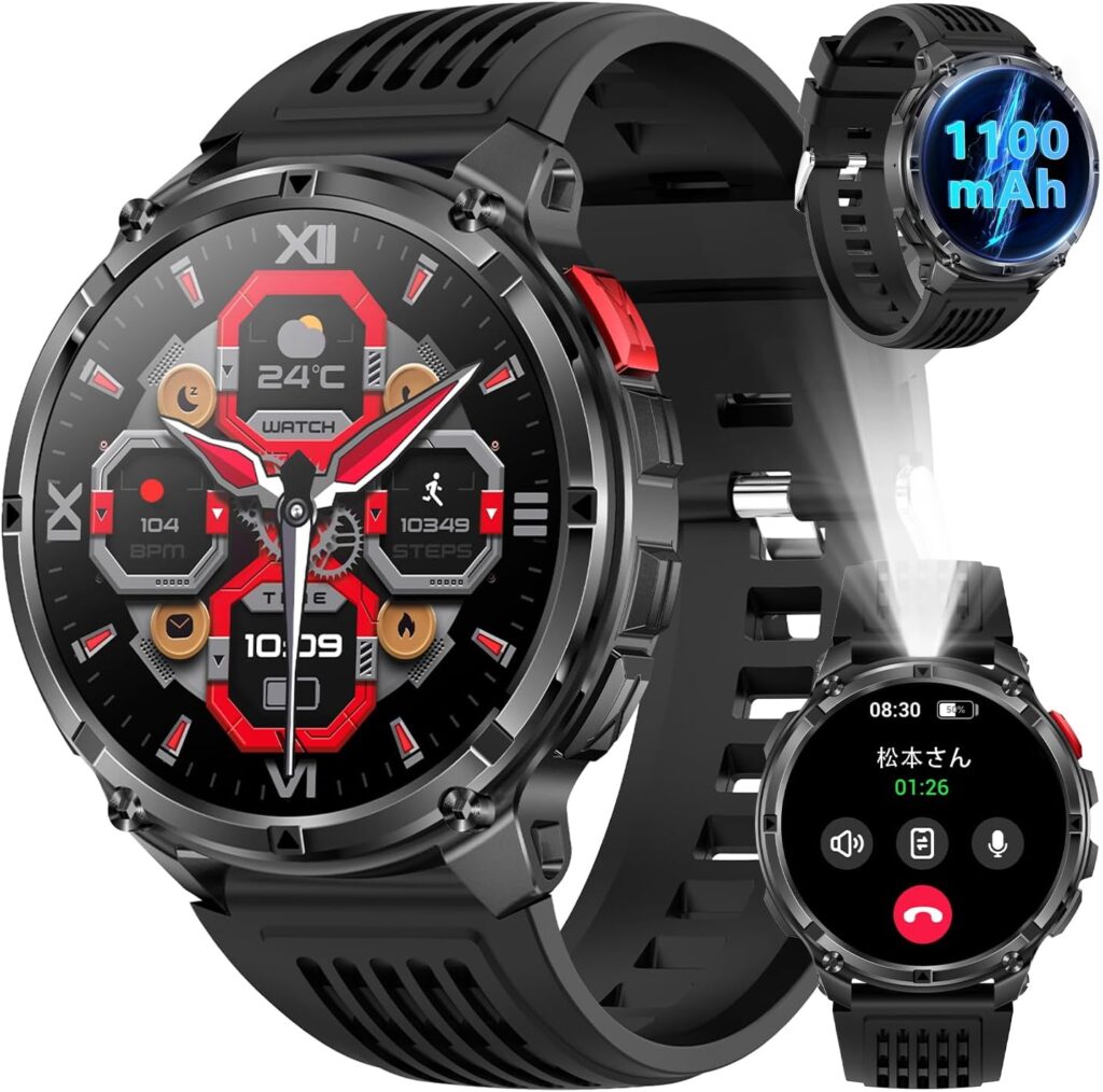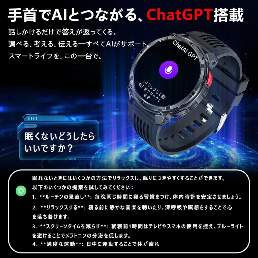 - 独自機能:ChatGPT搭載、1100mAh高続航、1.7インチ大画面、軍用規格、IP68防水、懐中電灯機能、100+スポーツモード、Bluetooth5.3通話、スマート音声アシスタント