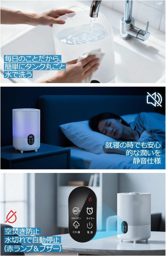 「2031B」の魅力は、単に加湿できるという60点の基本性能を超え、ユーザーの潜在的な悩みを解決する100点の付加価値にあります。特に際立つのは、「手間を省き、清潔を保つ」という点です。