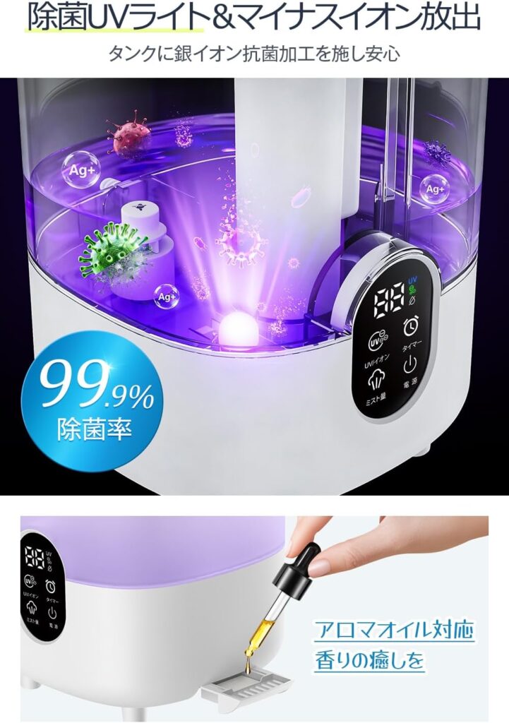 次に、アロマディフューザー機能とマイナスイオン機能の同時搭載です。これは、単なる「加湿」から「空間プロデュース」へと価値を高めています。アロマで心地よい香りを広げ、マイナスイオンで空気を整えることで、加湿器を乾燥対策の道具ではなく、リラクゼーションのための家電へと昇華させています。夜の寝室や、集中したいオフィスのデスク周りで、この「多重効果」は非常に強力な味方となります。