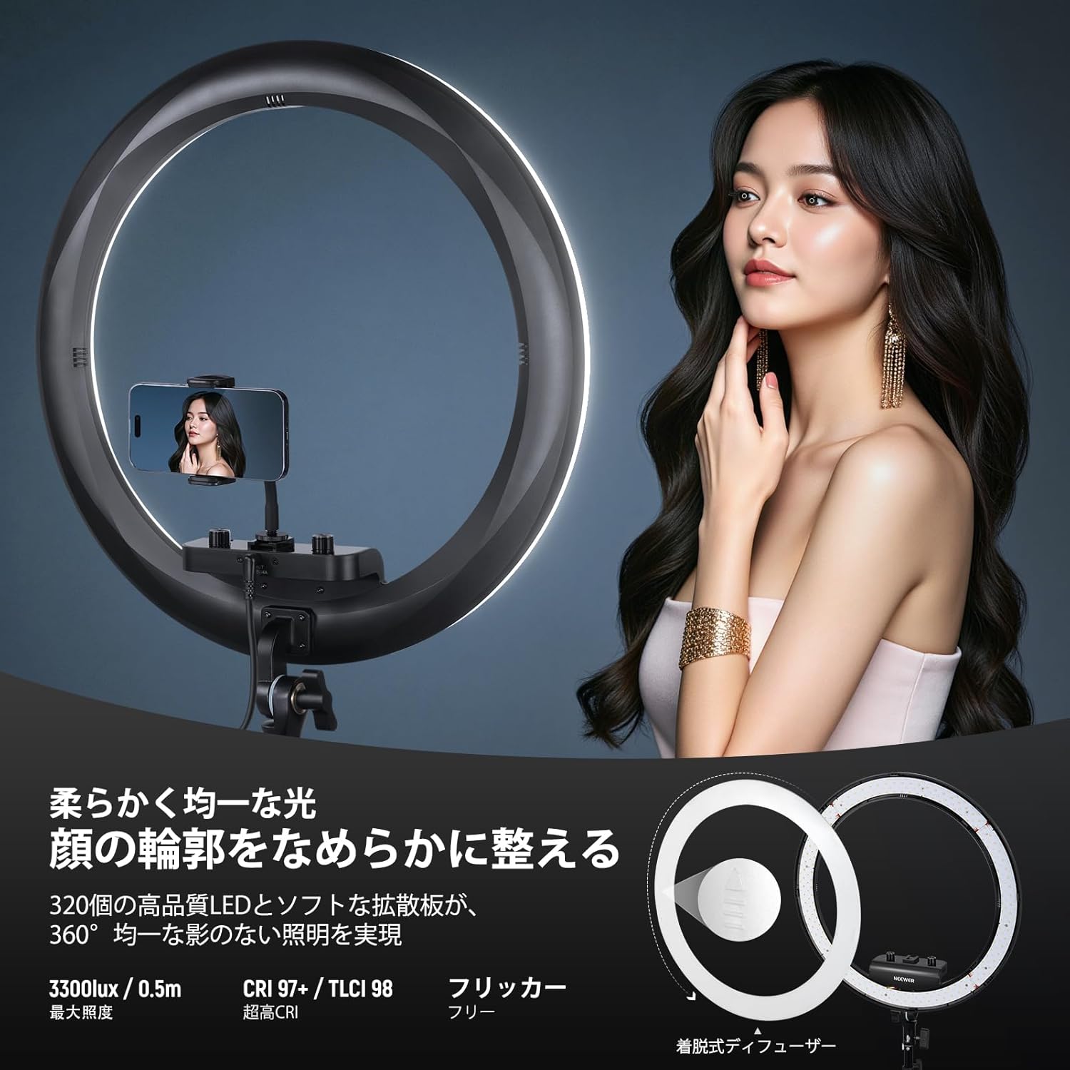 本製品の最大の魅力は、「18インチ」という圧倒的な物理サイズがもたらす光の質にあります。小さな光源ではどうしても影が強く出てしまいますが、この大型リングライトは顔全体を包み込むように柔らかく照らすため、肌の凹凸を目立たなくさせる「美肌効果」が物理的に期待できます。