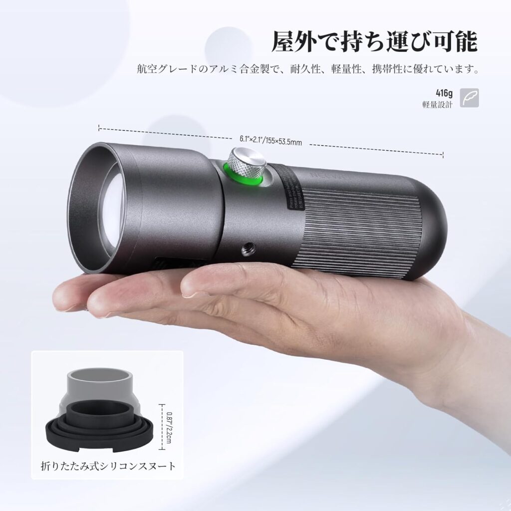 わずか85gという、卵2個分にも満たない軽さは、長時間の撮影において手首への負担を劇的に軽減します。さらに、付属のシリコン製スヌートが秀逸です。通常、光を絞るためのアクセサリーは嵩張るものですが、これは折りたたみ可能で柔軟です。これにより、カフェのテーブル上のような狭いスペースでも、背景を暗く落として被写体だけを浮かび上がらせる「ドラマチックな演出」が誰でも簡単に行えます。スムーズズーム機能と合わせることで、光の質を自由自在に操れる点は、同価格帯の製品にはない大きなアドバンテージです。