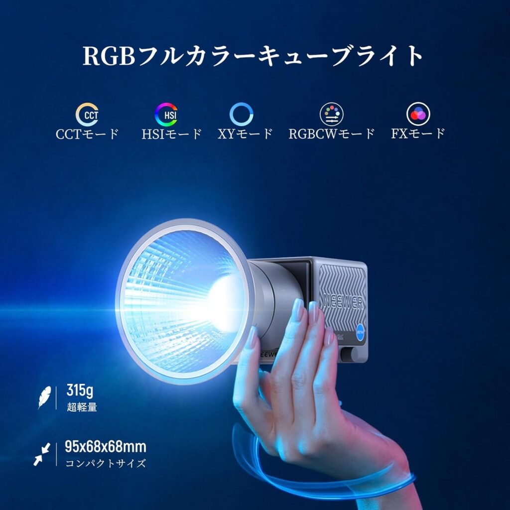 Amaran製品はバッテリープレートやケースが別売りの場合や、作りが簡素な場合がありますが、HS60Cは付属品にディフューザーやミキシングチャンバーまで含まれており、箱を開けてすぐに多彩な表現が可能です。初心者が最初に手にする一台として、追加出費が少ないのはNEEWERならではの優しさと言えるでしょう。