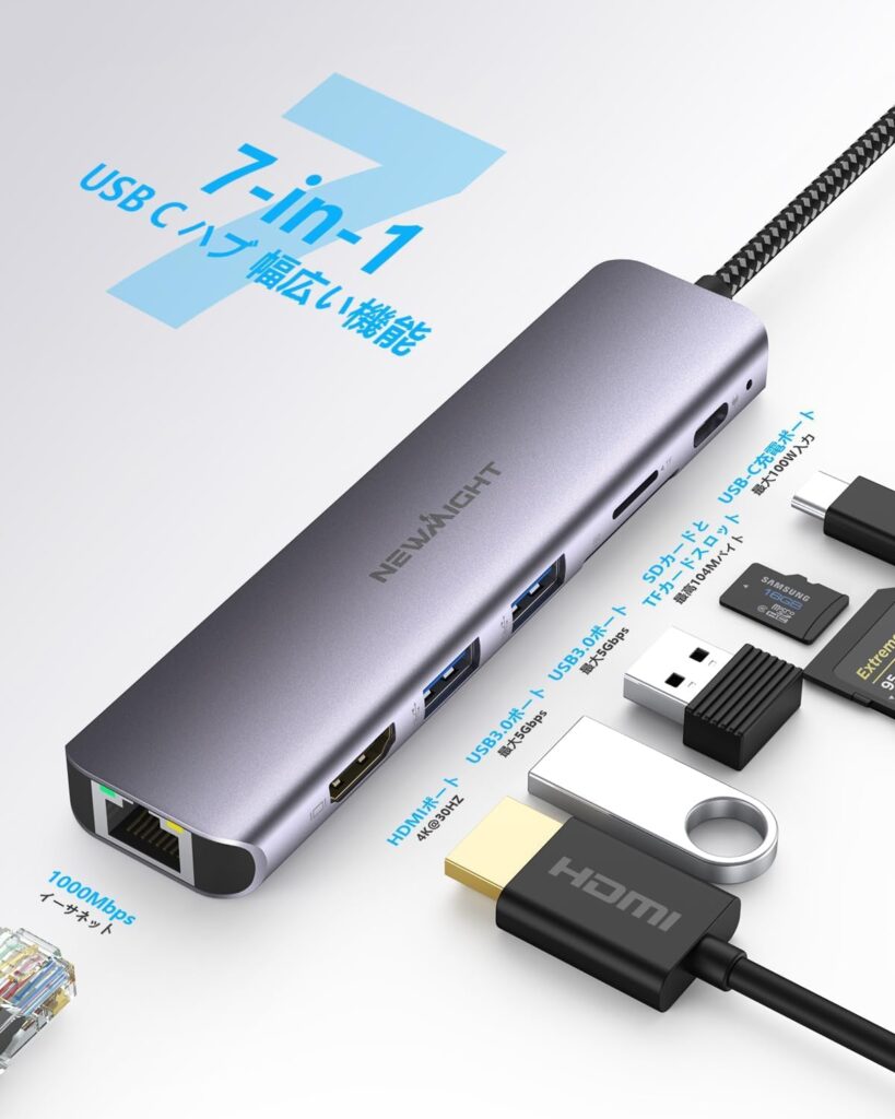 コストパフォーマンスと多機能性のバランスを求める方には、Newmight USB C ハブ 7-in-1(約3,000円)が適しています。