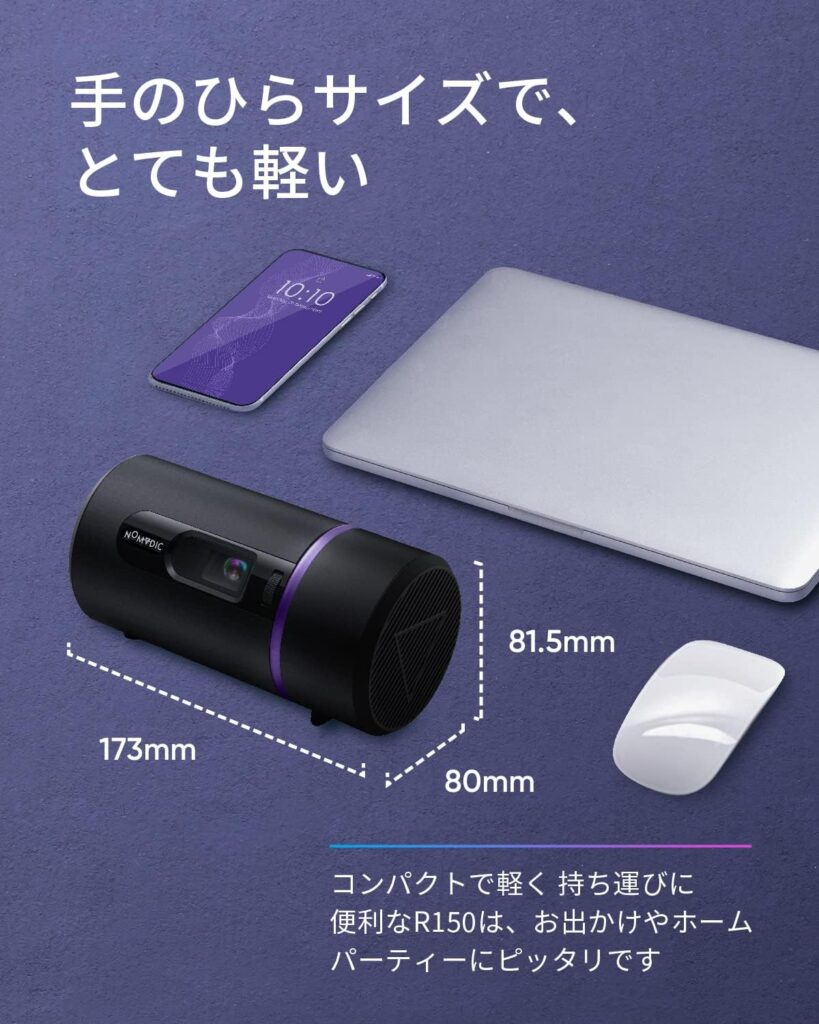 そして、彼らが世に送り出した傑作「NOMVDIC モバイルプロジェクター R150」に焦点を当てます。このR150は、重さわずか0.7 kgの「カバンにスッと入るサイズ」でありながら、ネイティブ解像度 854×480 の画面を最大100インチまで映し出す、まさに「手のひらサイズの映画館」なんです。