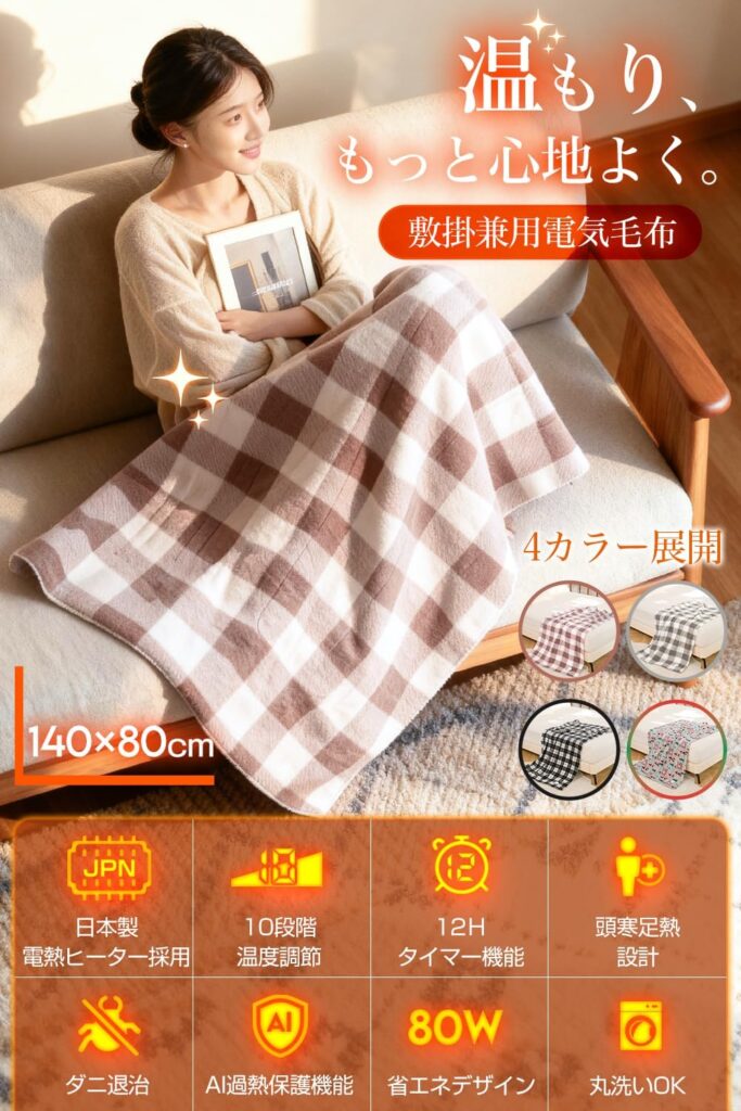 次に「使い勝手の良さ」です。140×80cmという絶妙なシングルサイズは、寝室の敷き毛布としてだけでなく、リビングでのひざ掛け、または着るブランケットのように肩から羽織るなど、利用シーンを選びません。この多様性により、寒い場所をピンポイントで暖められるため、家全体の暖房に頼る必要がなくなり、節電効果も期待できます。さらに、軽量設計であるため、持ち運びが非常に簡単で、お気に入りの暖かさを家中のどこへでも連れて行ける感覚は、まるで自分専用の暖房空間を手に入れたような満足感を与えてくれるのです。