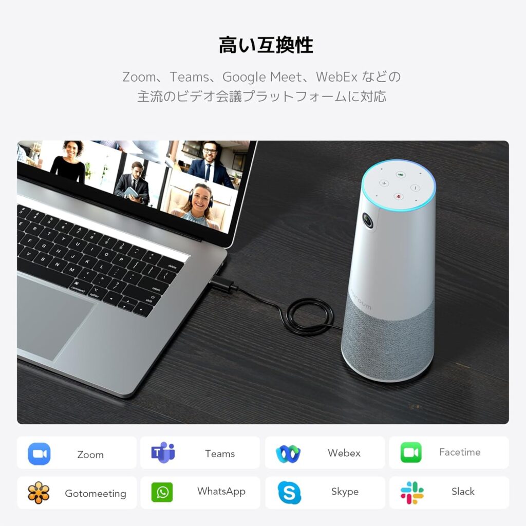 - 広範囲の集音能力: 複数の高性能マイクを搭載し、部屋のどの位置から話しても均一かつクリアに音声を拾います。大人数が参加する会議でも、誰が話しているのかを明確に相手に伝えます。