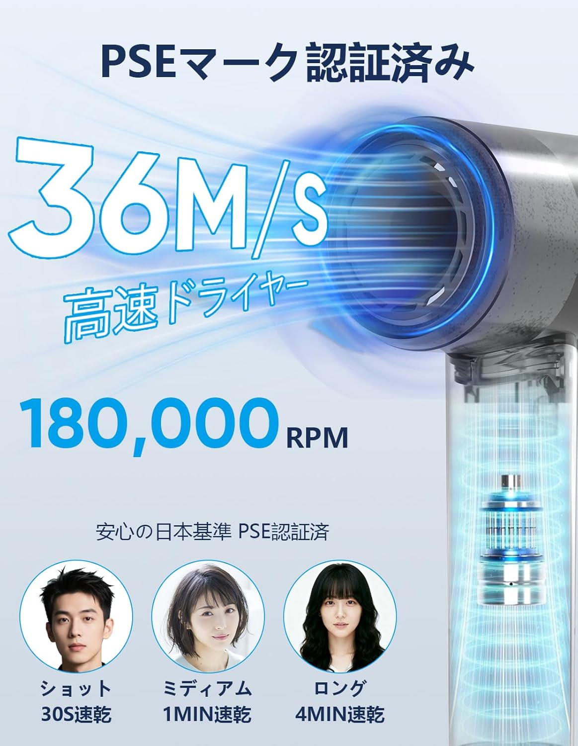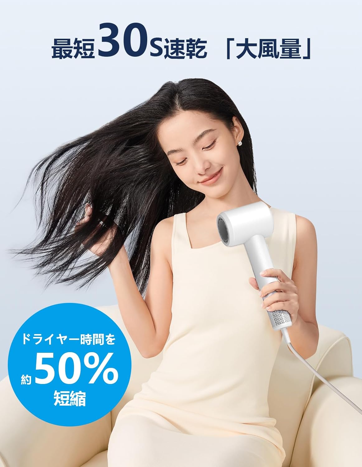 - 「毎朝のドライヤー時間が以前の半分以下になりました。風量が台風並みに強くて、髪の根元まで一気に風が届く感覚は爽快そのものです」