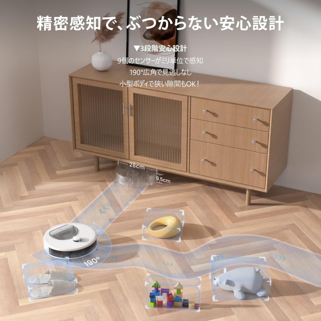 一方で、高機能をコンパクトなボディに凝縮したことによるトレードオフも見受けられます。本体サイズを抑えたことで取り回しは向上しましたが、その分ダストボックスの容量が450mlに制限されています。自動ゴミ収集機能付きのステーションを持たないモデルであるため、ペットを多頭飼いしている世帯や広範囲を一度に掃除する場合は、頻繁なゴミ捨てが不可欠となります。また、LiDARセンサーの突起が本体上部にあるため、わずか数センチの差で「ソファの下に入り込めない」といった事態が起こる可能性も否定できません。購入前には家具の下の隙間を厳密に測定しておく必要があります。