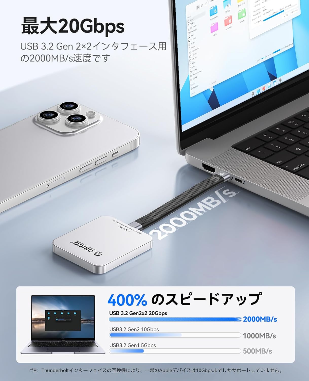 まず、速度面で比較すると、多くのユーザーが手にするSamsungの「T7」シリーズやSanDiskの「エクストリーム ポータブルSSD」の普及モデルは、最大転送速度が約1050MB/sに設定されています。これに対し、本記事で紹介しているORICOのモデルは2000MB/sをマークしており、数値上は2倍の性能を誇ります。