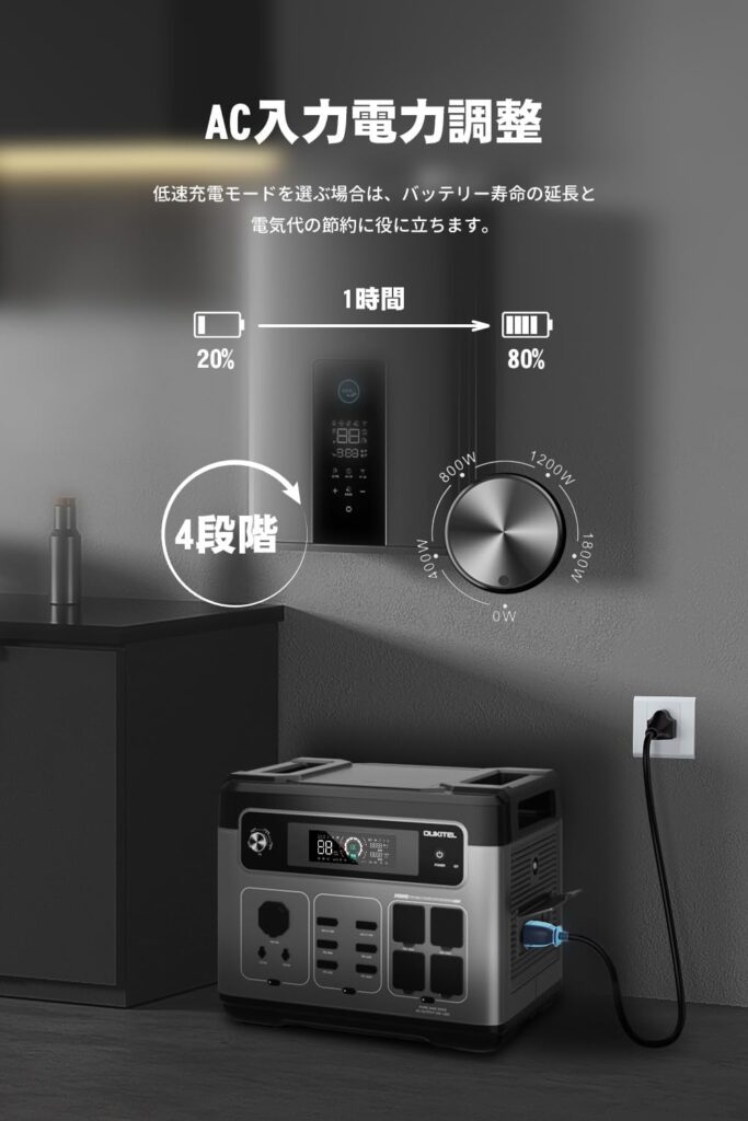 - AC入力電力調整: 400W/800W/1200W/1800Wに4段階で調整可能
