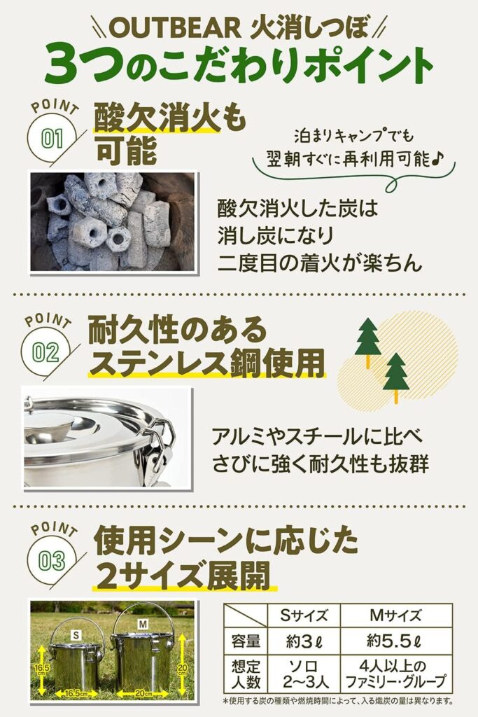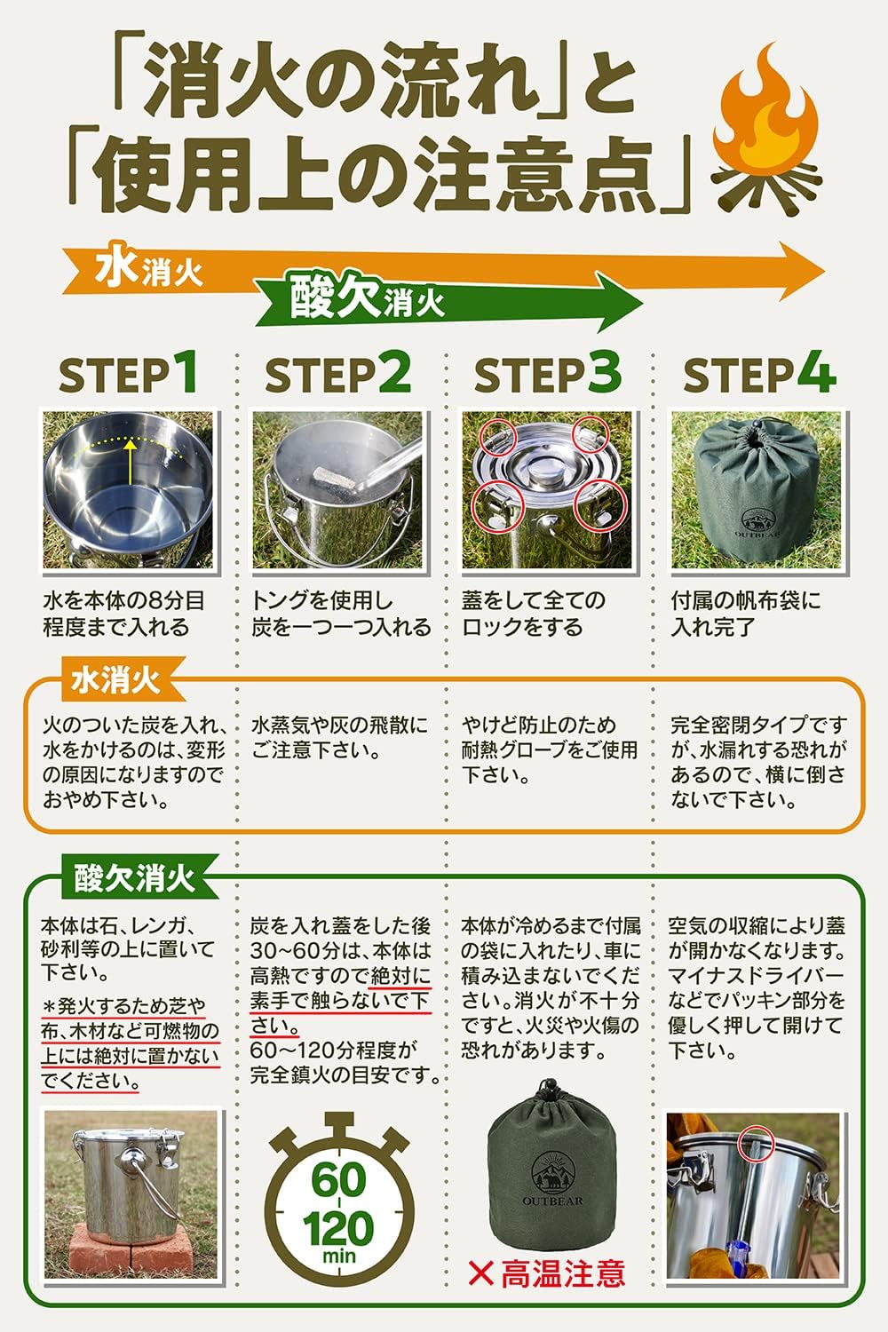 • 消火方法:水消火と酸欠消火の両方に対応。 水消火は即座に撤収したいデイキャンプやBBQに最適。 酸欠消火は時間はかかるが後片付けが楽。