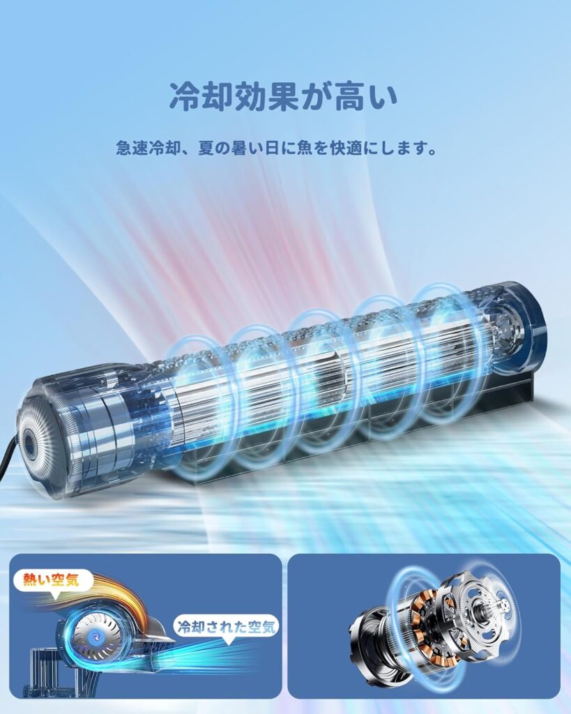 さらに、本体にデジタル水温表示があるため、現在の水温状況をリアルタイムで視認できるのも大きな強みです。ただ風を送るだけでなく、水温管理システムそのものをこの一台で担えるという点は、配線を減らしたいアクアリストにとって革命的とも言える利便性を提供しています。