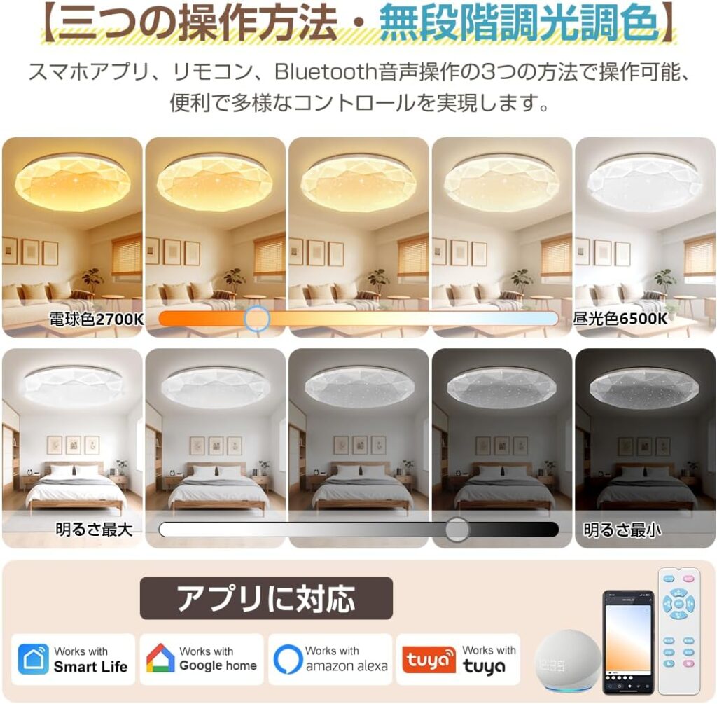 この商品の最大の魅力は、なんといっても「アプリ制御」によるライフスタイルの自動化です。単にスマホで操作できるだけでなく、アプリのスケジュール機能を使えば「朝7時に徐々に明るくなり、夜23時には暖色に切り替わる」といったサーカディアンリズムに合わせた照明環境を構築できます。これは従来のリモコン操作のみのシーリングライトでは実現できない体験です。