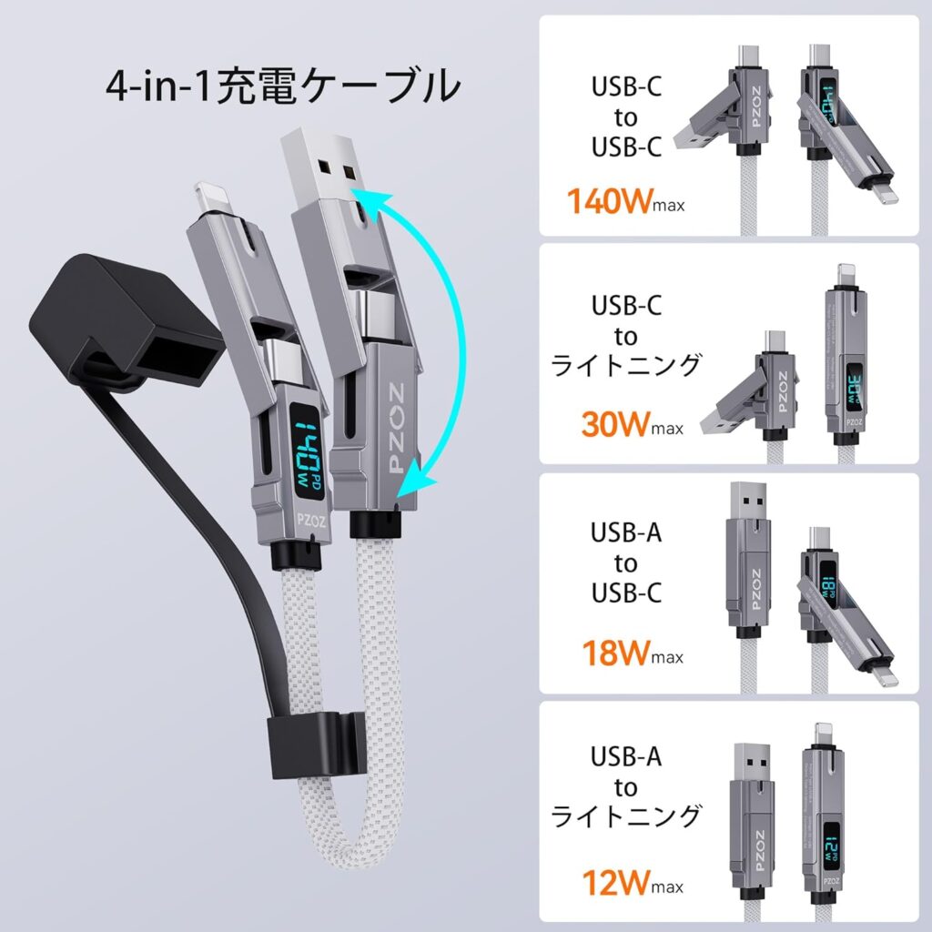 • PZOZ 4in1ケーブルの場合: 付属品情報により最大140Wに対応(USB PD 3.1規格に対応する高出力)し、複数の主流デバイスに対応するためのコネクタ統合を実現しています。