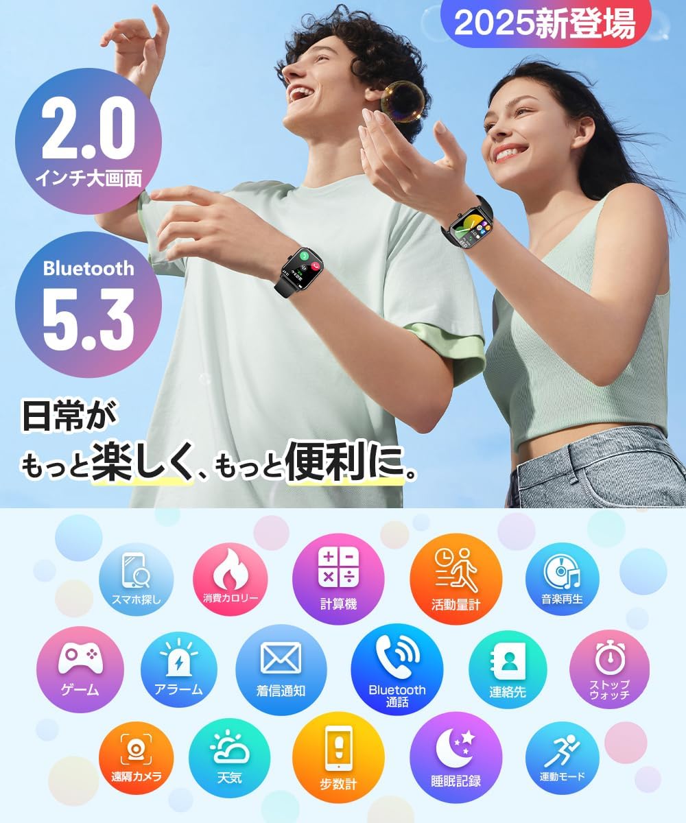 - 特徴天気予報、時間表示、IP68防水、長時間バッテリー、多種類文字盤、健康管理、2.0インチ大画面, 活動量計, 軽量, 音声通話, 音楽プレーヤー