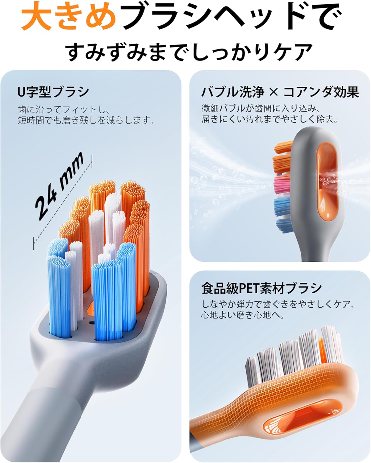 これに対し、RANVOO PH3は「バブル(泡)」に着目しています。振動だけでなく、発生させた泡の破裂力で汚れを弾き飛ばすイメージです。Sonicareの水流に近いですが、より「泡」によるソフトな当たり心地が特徴で、歯茎への優しさはトップクラスと言えます 。​
