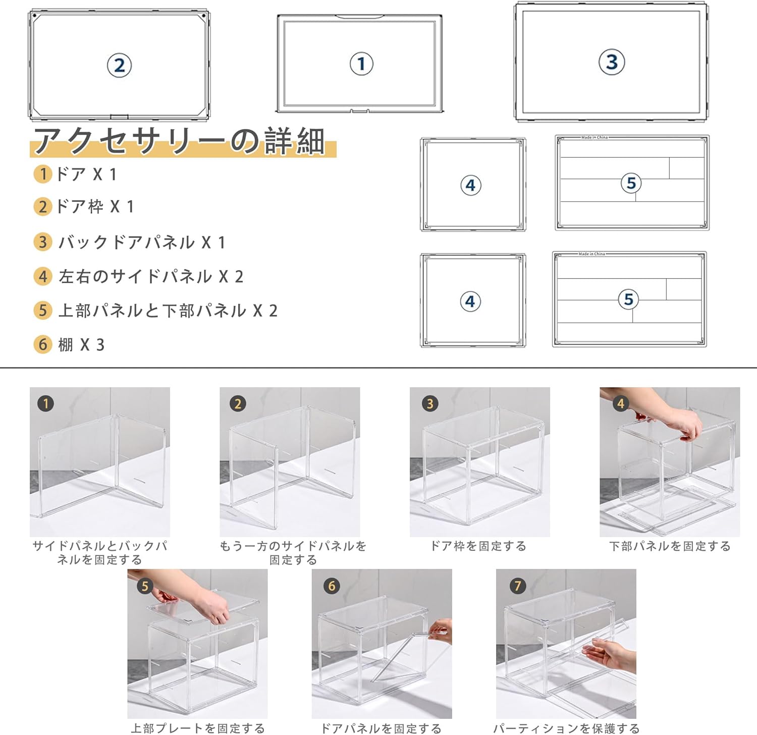 - 用途:フィギュア・模型のディスプレイのほか、靴・バッグ・化粧品・書籍などの収納にも対応
