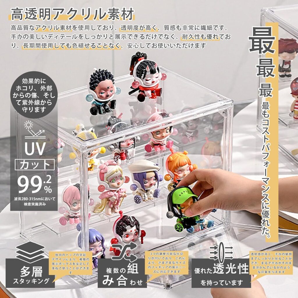 透明アクリル素材ならではのクリアな視認性に、防塵・防水・紫外線カットという三大保護機能を組み合わせ、さらにマグネット式扉や仕切り調整機能、点胶50個・クリーニングクロスといった付属品の充実度まで備えた、まさにコレクター目線で作り込まれた一品と言えます。
