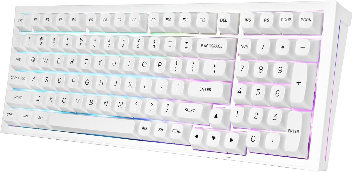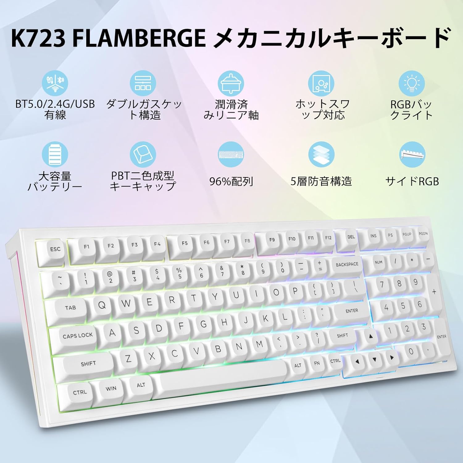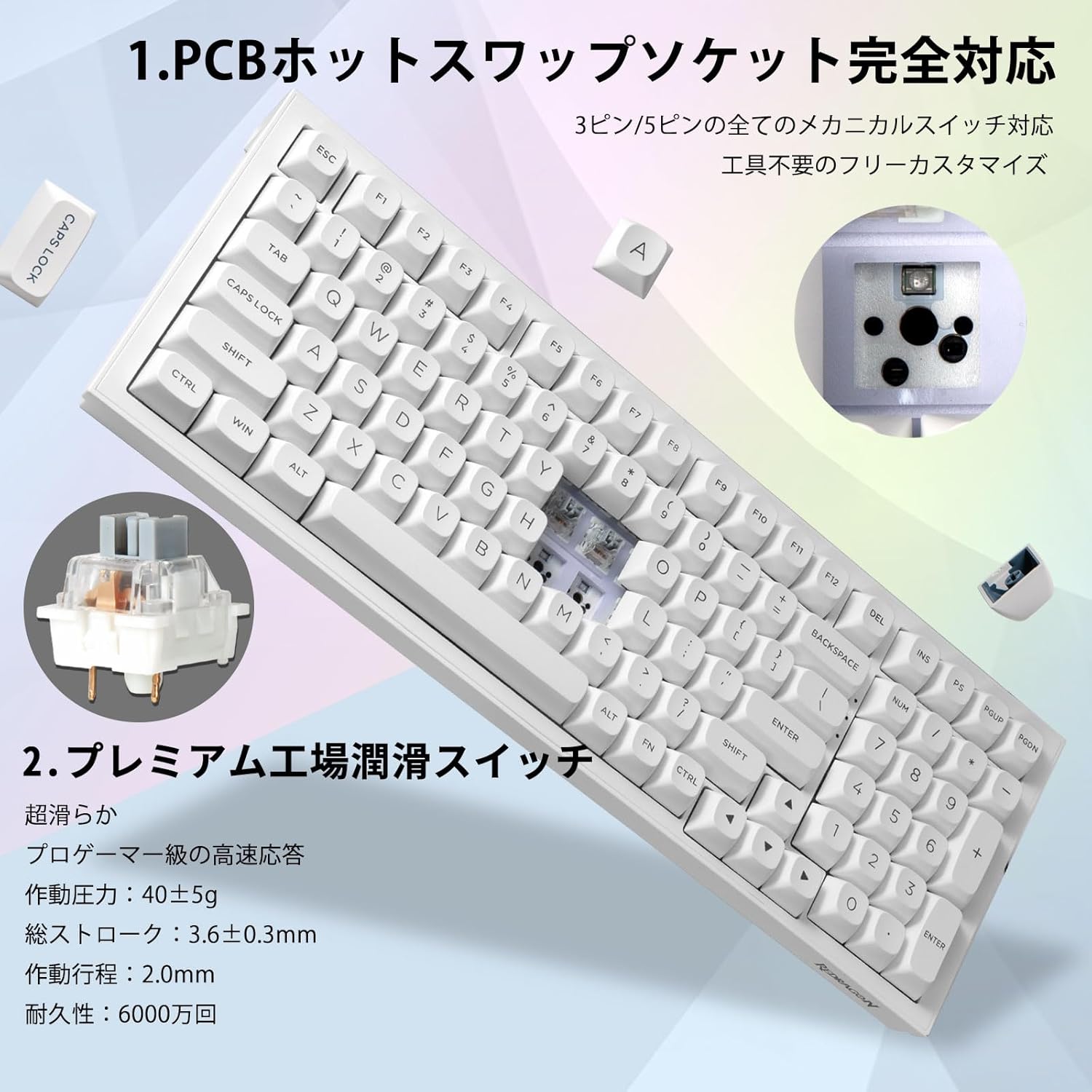 さらに「ホットスワップ機能」は見逃せません。これは、ハンダ付けなしでキースイッチを交換できる機能を指します。もし特定のキーの反応が悪くなったり、押し心地に飽きたりしても、自分でスイッチだけを交換して新品同様の使い心地を維持できます。つまり、「使い捨て」ではなく「長く愛用できるベース機」として設計されているのです。ホワイトの清潔感あるデザインにRGBライティングが合わさり、実用性とインテリア性を兼ね備えた、まさに「価格破壊」の象徴的モデルと言えます。