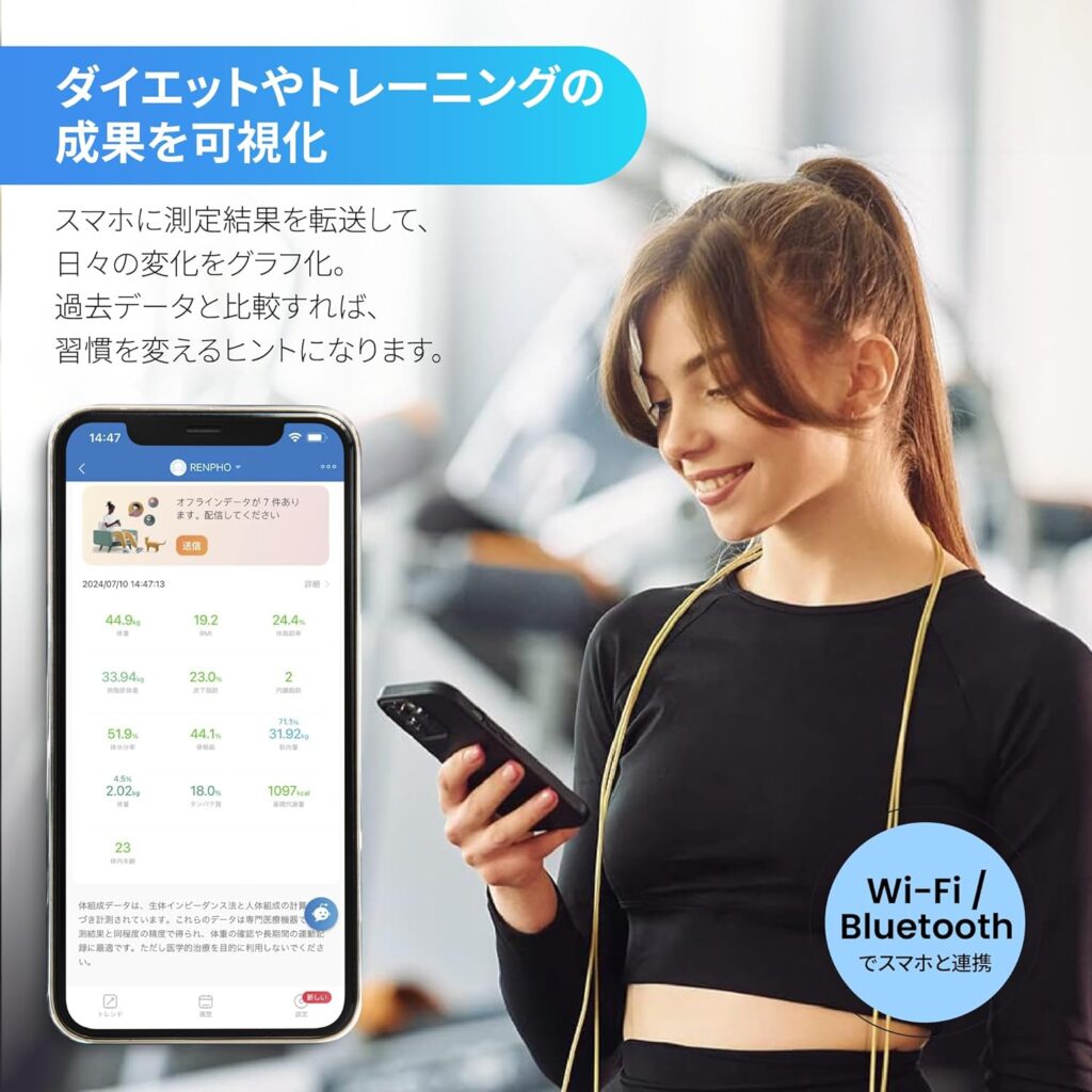 さらに特筆すべきは、専用アプリ「Renpho Health」の質の高さです。単に体重を表示するだけでなく、BMI、体脂肪率、皮下脂肪、内臓脂肪、筋肉量、骨量、体水分率など、13項目以上の健康指標を瞬時に可視化します。これらのデータは週単位、月単位、年単位でグラフ化されるため、「先月より筋肉量が増えた」「年末年始で体脂肪が増えた」といった体の微細な変化を直感的に把握できます。モチベーション維持が難しいダイエットにおいて、この「変化の見える化」は最強の武器となります。