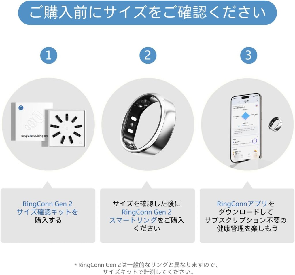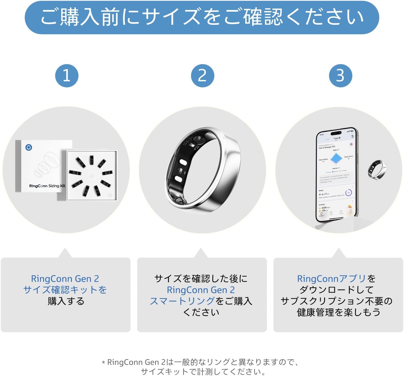 - 付属品:RingConn Gen 2 スマートリング, Type-C ケーブル, クイックガイド, 充電ケース, 取扱説明書