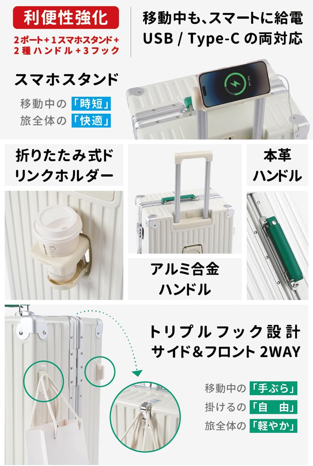 2026年現在、フロントオープン機能を持つスーツケースが注目を集めています。TIERRALの「TOMARU 2.0 Sサイズ」やエースの「パリセイド 3-Z」は、スーツケースを立てたまま前面ポケットから荷物を出し入れできる設計で、駅や空港での利便性が高く評価されています。こうしたモデルは、ビジネス書類やノートPCを頻繁に取り出す必要がある出張者にとって非常に有用です。RTmoni LF-005にはこうした先進的な機能は搭載されていないため、基本的な移動手段としてのシンプルさを求めるか、付加価値を重視するかで選択が分かれるでしょう。フロントオープンモデルは価格が高めですが、頻繁な出張や長期的な使用を考えるなら投資効果は高いと言えます。