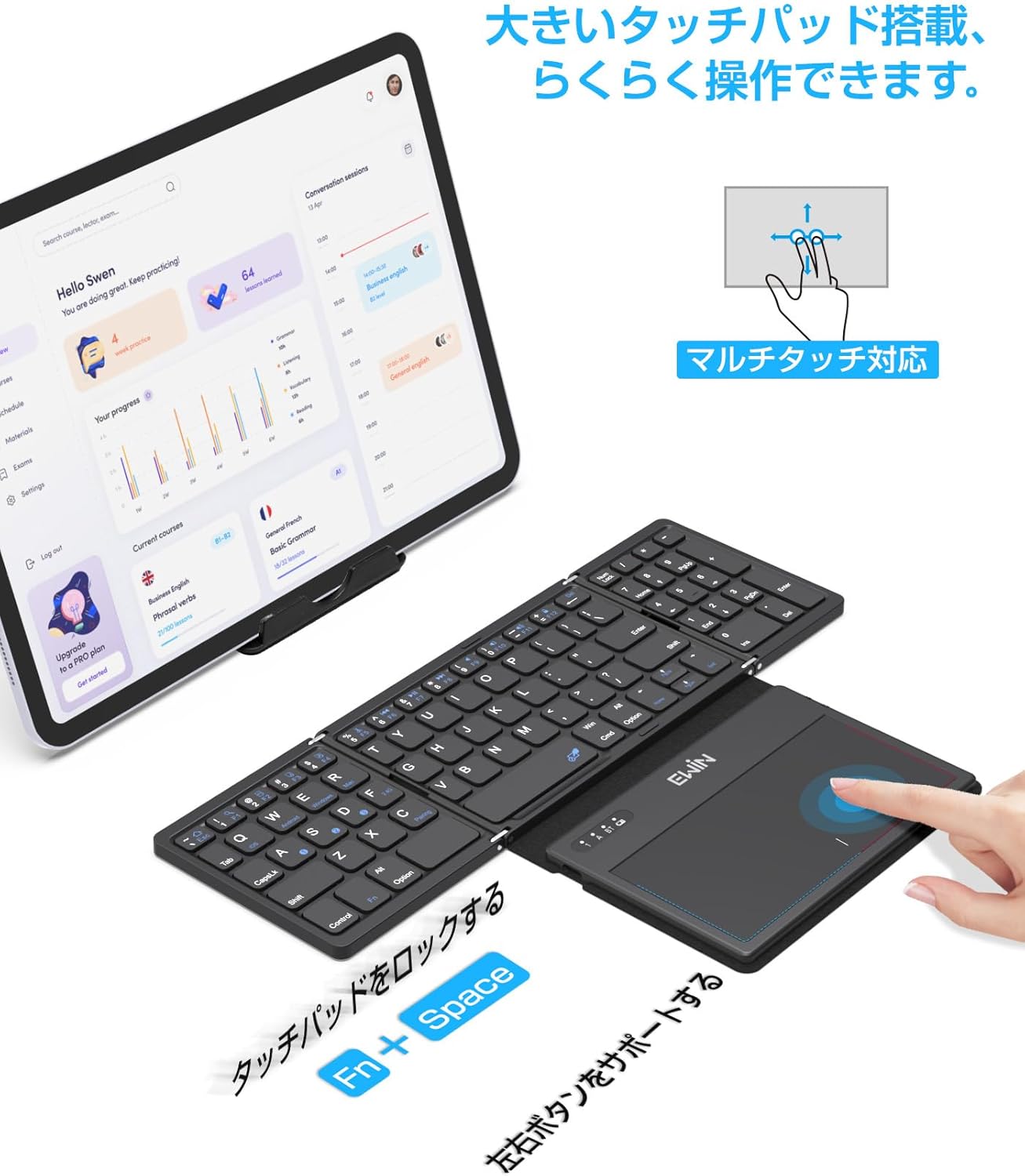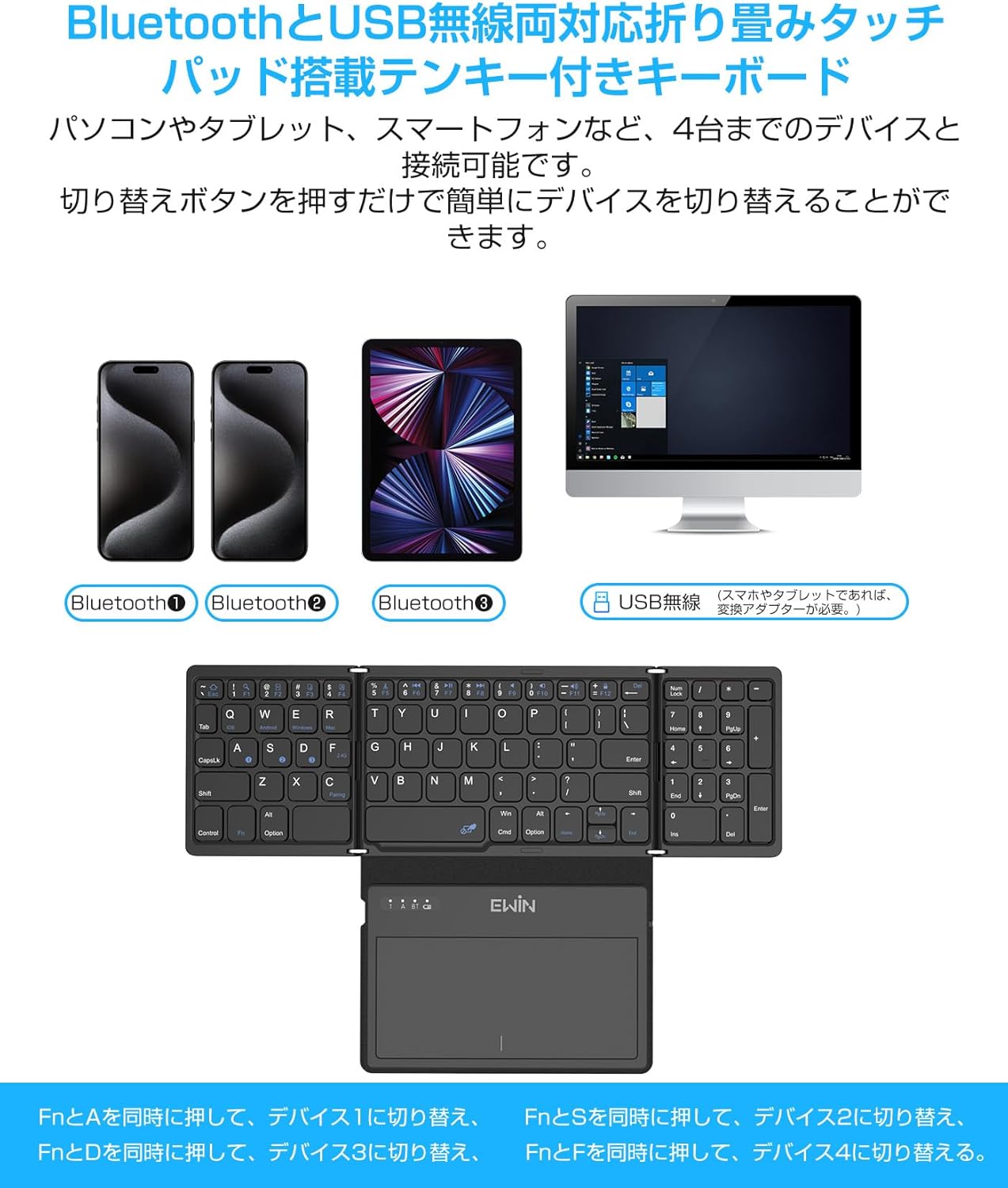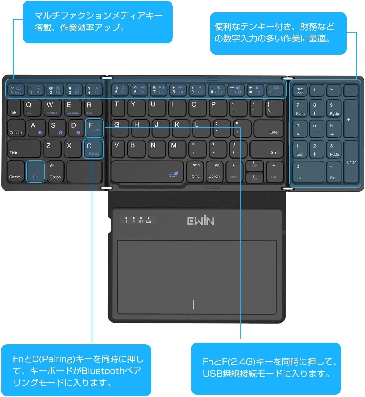 - キーボードの説明: BluetoothとUSB無線両対応折り畳みタッチパッドとテンキー搭載キーボード