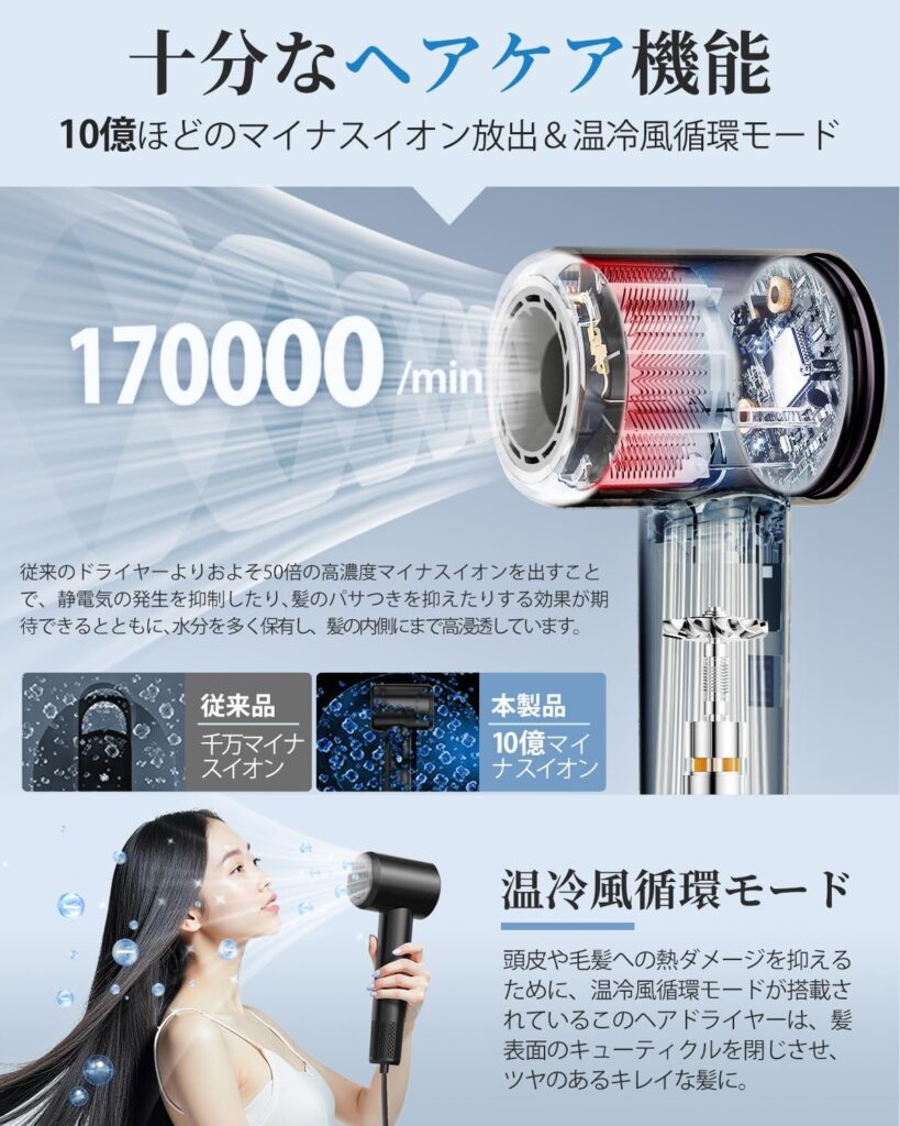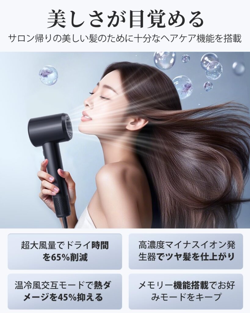 「この価格帯のドライヤーとしては驚くほど静かな動作音で、夜遅い時間でも家族に気兼ねなく使えます」