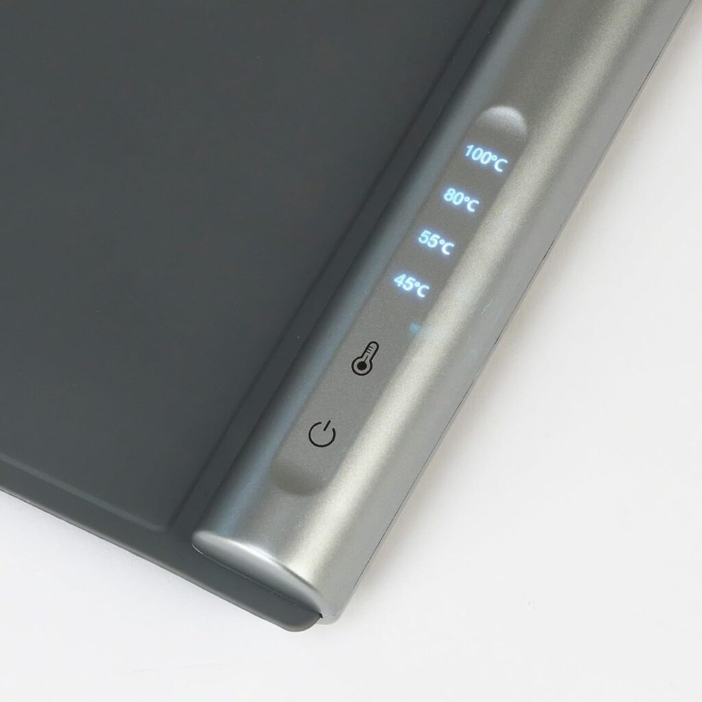 タッチパネルは汚れた手でもさっと操作できる実用性を備えており、食事中に追加操作が必要なシーンでもストレスを感じません。 4段階の温度設定は、料理の種類や食べるスピードに合わせた細やかな調整を可能にします。 スープのように冷めやすいものは高めの設定で、デリケートな魚料理は低めの設定で、という使い分けが手軽にできる点は、日常的な食卓に確かな快適さをもたらします。 また、210Wという消費電力は、保温プレートとしては比較的控えめな数値であり、継続使用においても必要以上の電力を消費しない設計です。
