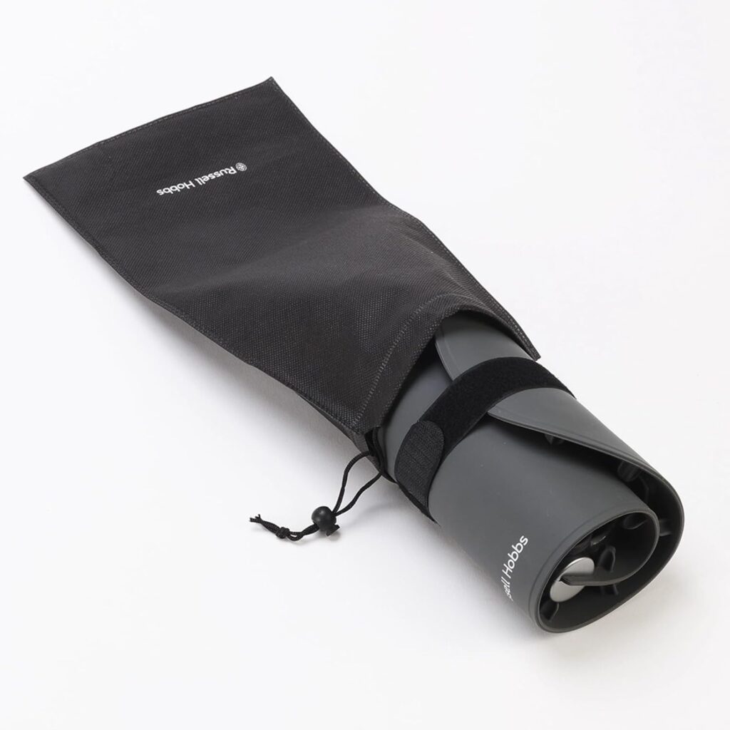 対してRussell Hobbs 3300JPが優る点は、ブランドデザインの洗練さと素材の上質感です。 グレーを基調としたシンプルなフォームは、インテリアとしての存在感があり、テーブルに出しっぱなしでも絵になる佇まいです。 また、収納袋と収納バンドのセット付属という携帯性の高さは、アイリスオーヤマ製品には見られない3300JPならではの付加価値といえます。