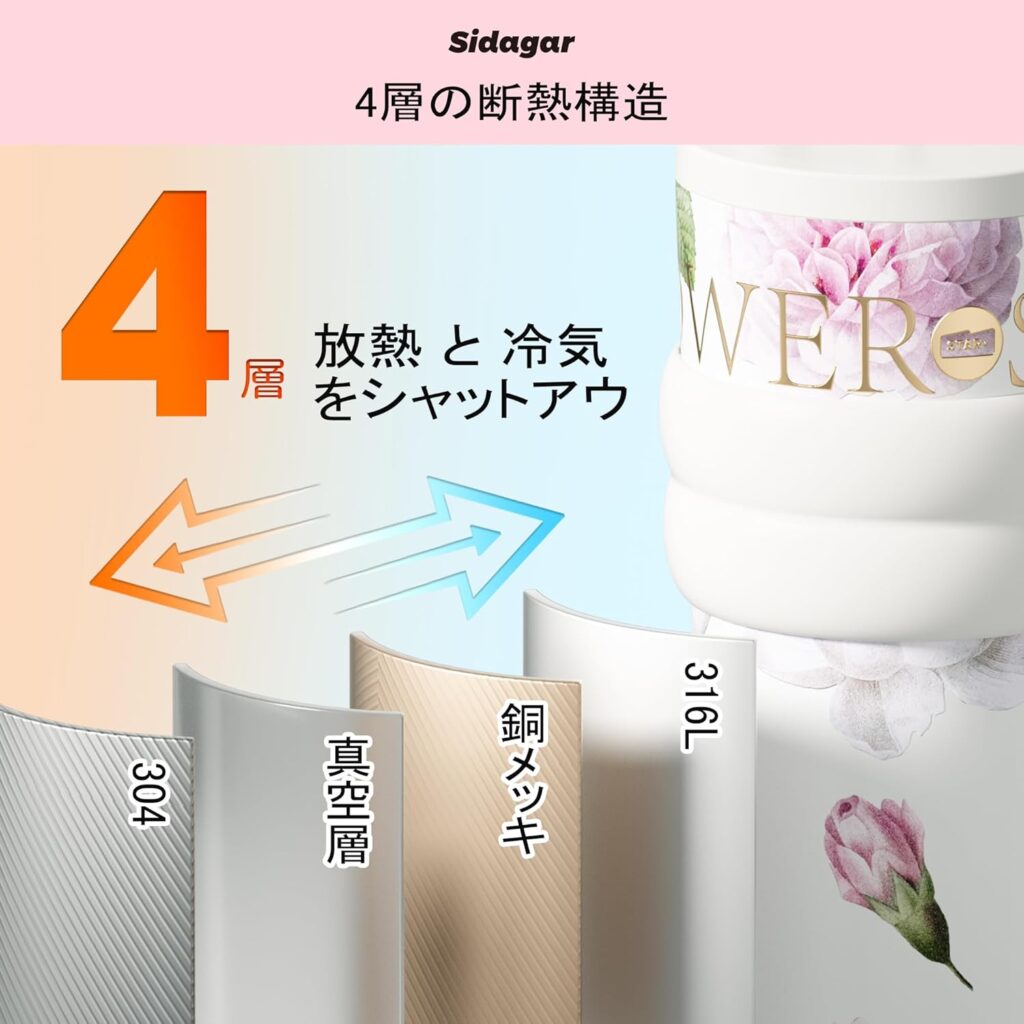 - 高度な断熱技術:革新的な断熱技術により、飲み物を最大24時間冷たく、最大12時間熱く保つことが可能。いつでもどこでも、冷たい飲み物や温かい飲み物を楽しめる。